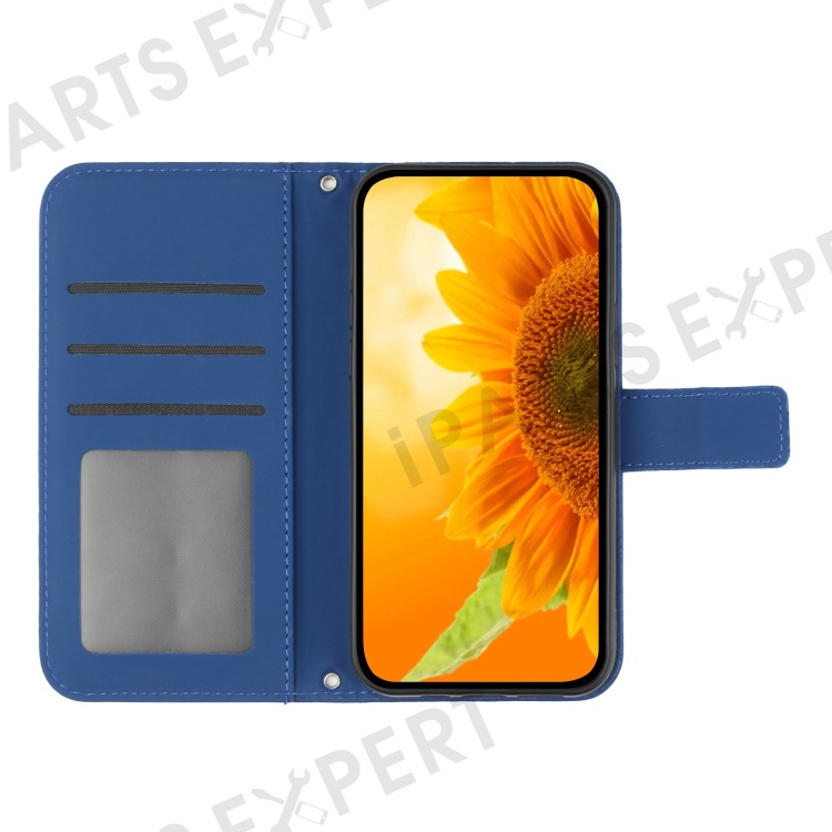 For Samsung Galaxy A72 4G / 5G Phone Case, HT04 Skin-Touch PU Leather Imprinted Sunflower Stand Wallet Cover with Hand Strap - Sapphire