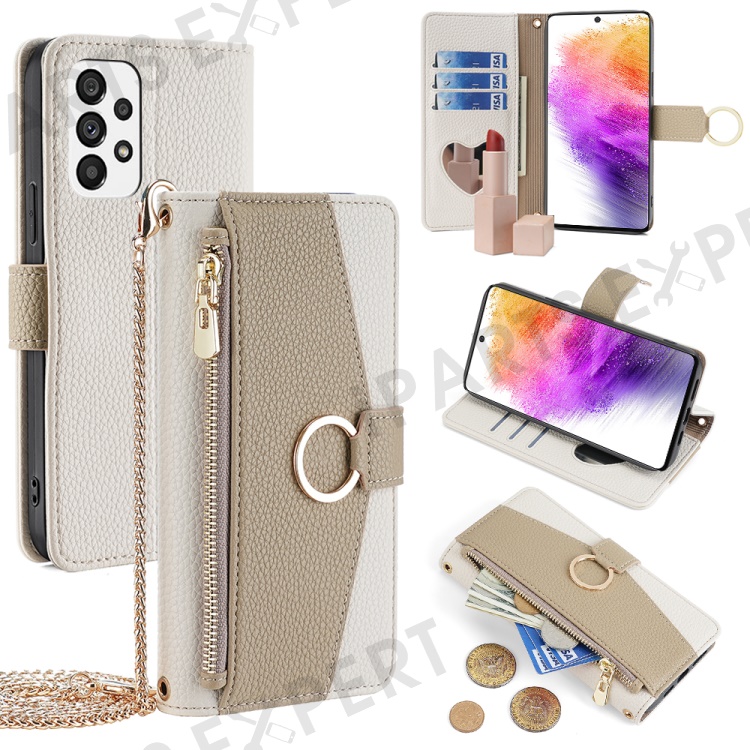For Samsung Galaxy A73 5G Zipper Flip Cover PU Leather Phone Case with Crossbody Strap - White
