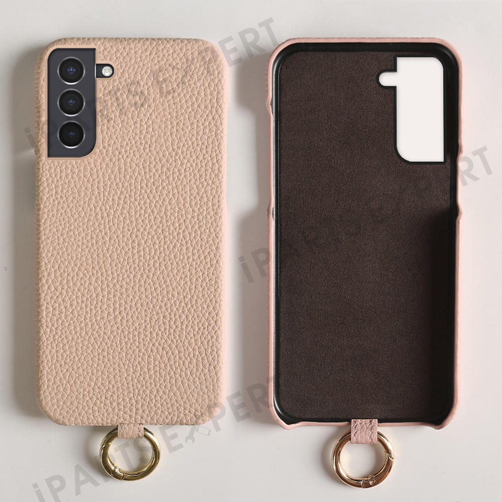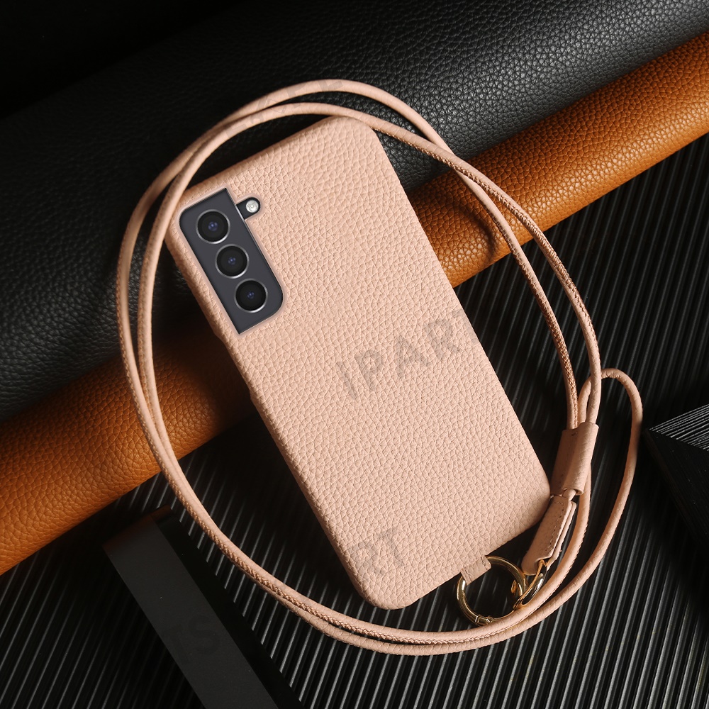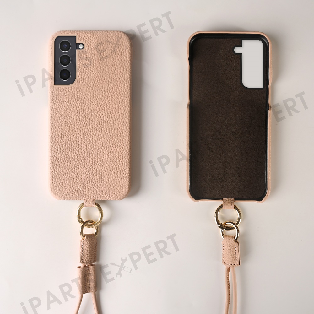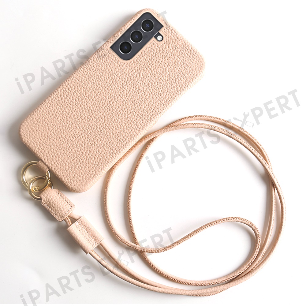 For Samsung Galaxy S21 4G / 5G Case with Lanyard Genuine Cow Leather PC Phone Back Cover - Pink