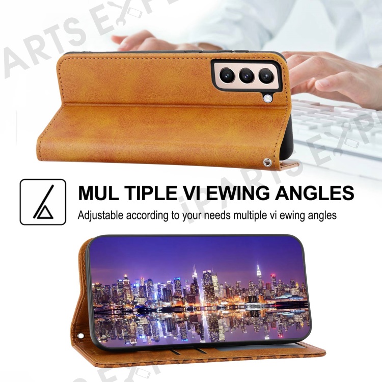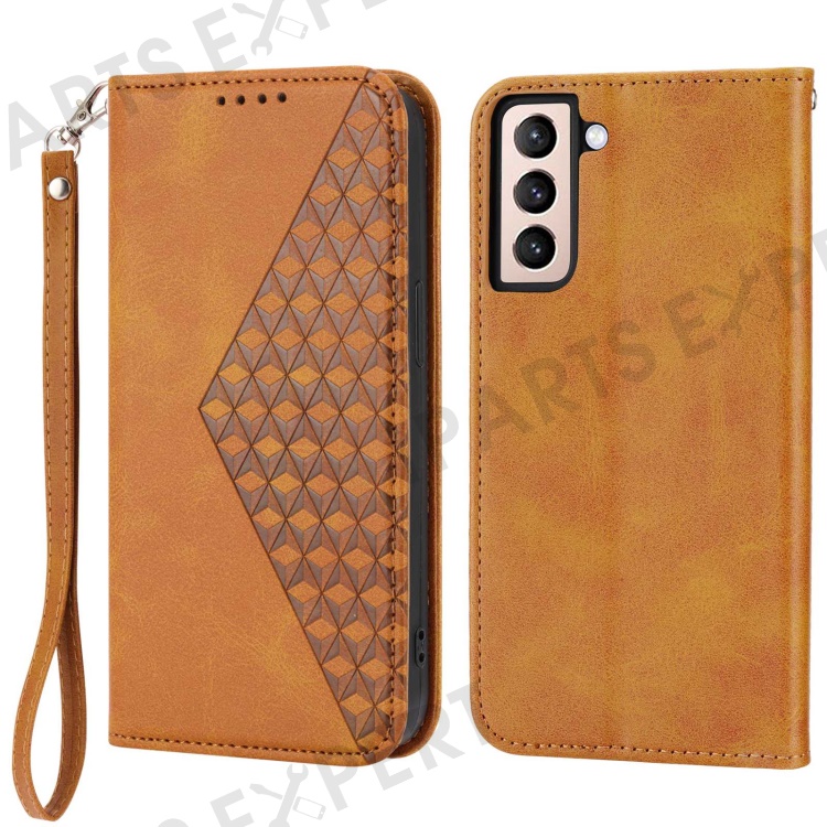 For Samsung Galaxy S22 5G Imprinted Rhombus Pattern Wallet Stand Phone Case Calf Texture PU Leather Shockproof Cover with Strap - Yellow