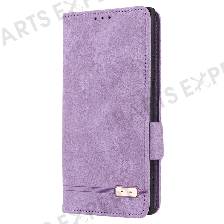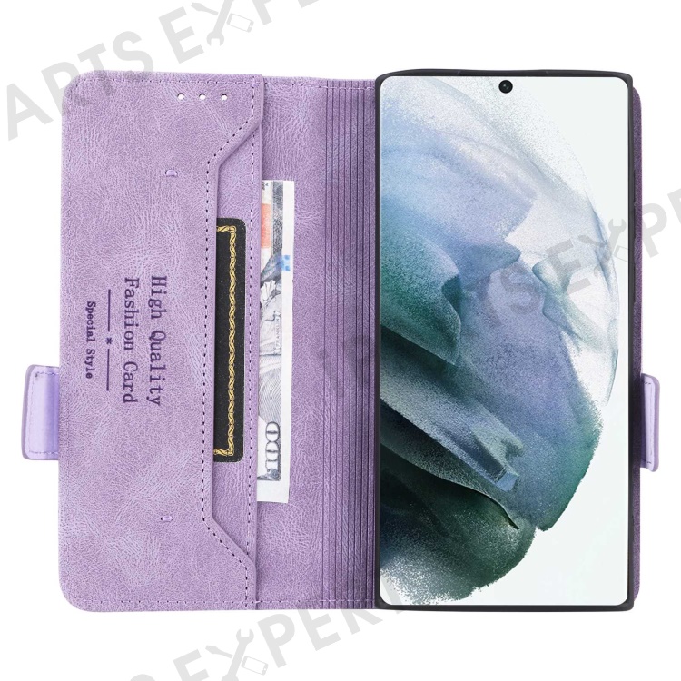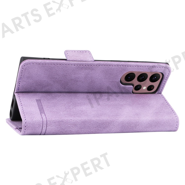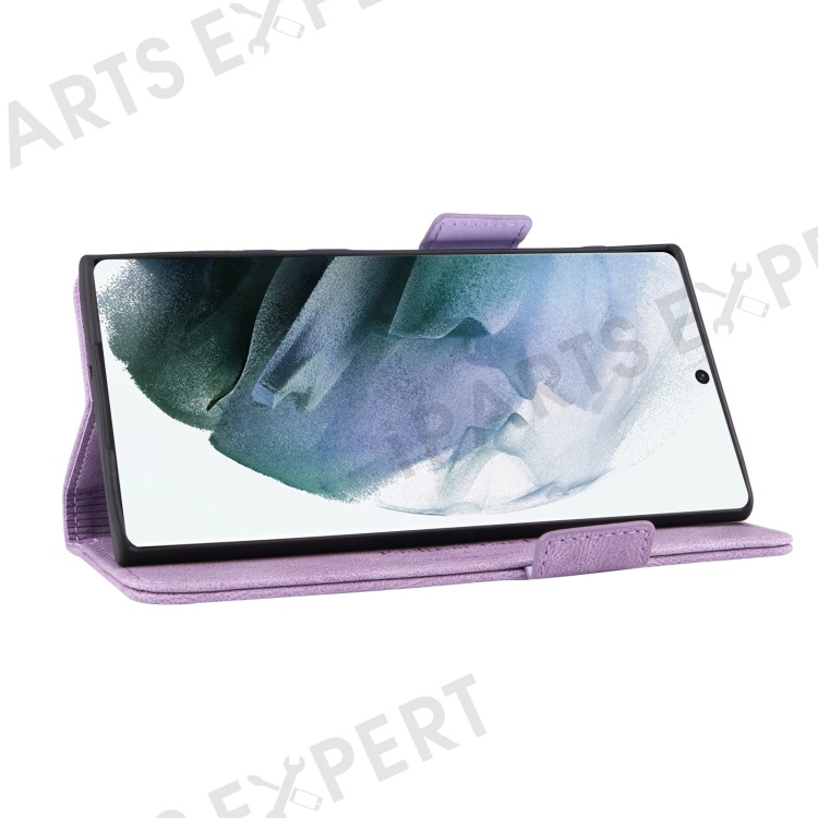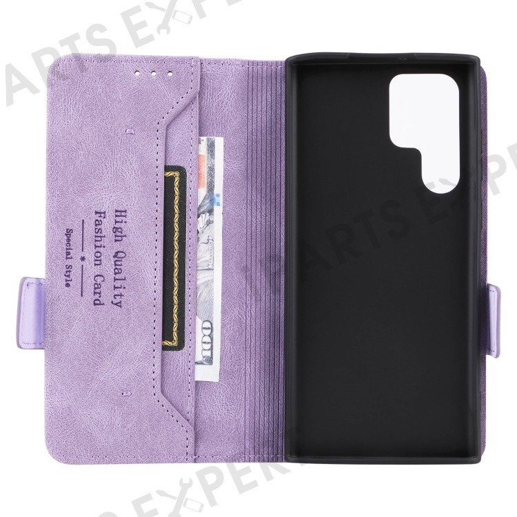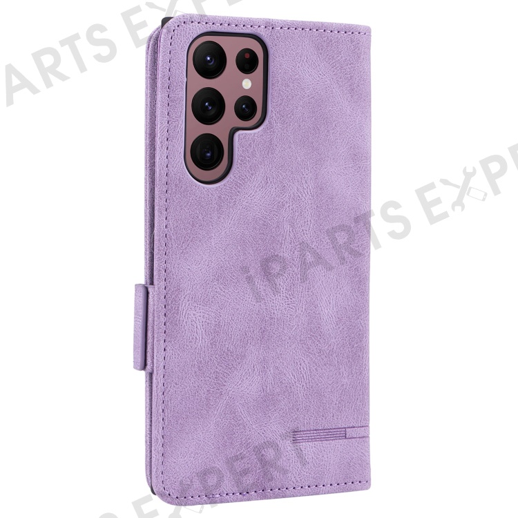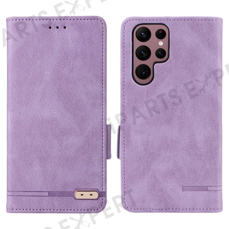 For Samsung Galaxy S22 Ultra 5G Hardware Decor Drop-proof Phone Case PU Leather+TPU Anti-wear Wallet Stand Shell - Purple