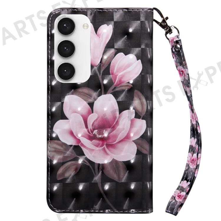 For Samsung Galaxy S23 3D Pattern Printing Anti-scratch Stand Case PU Leather Drop-proof Phone Wallet Cover with Strap - Pink Flower