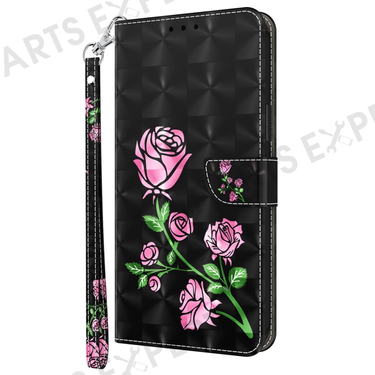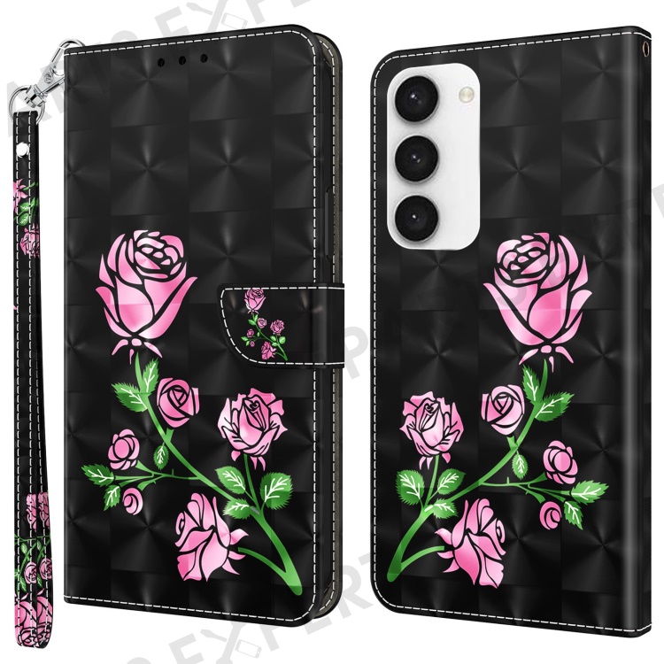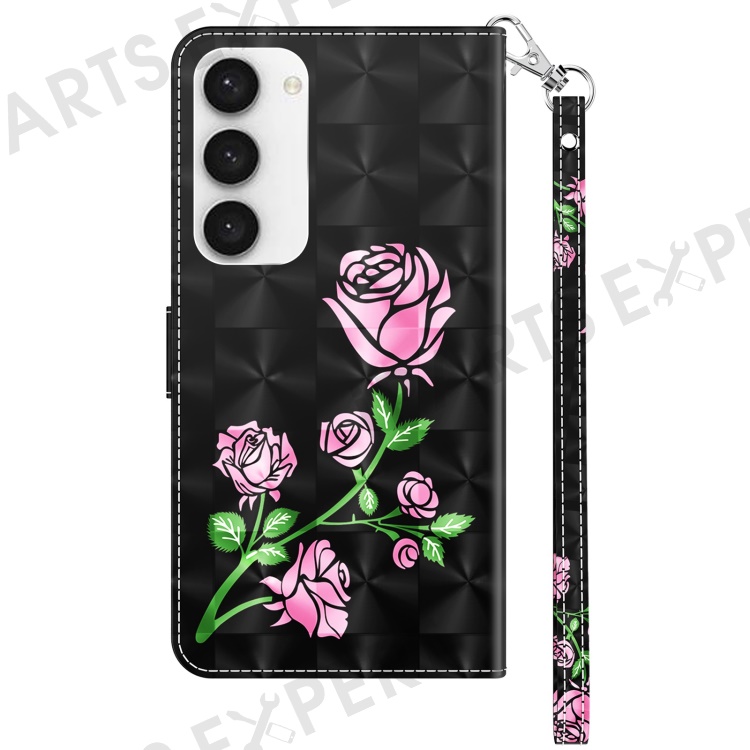 For Samsung Galaxy S23 3D Pattern Printing Anti-scratch Stand Case PU Leather Drop-proof Phone Wallet Cover with Strap - Rose Flower