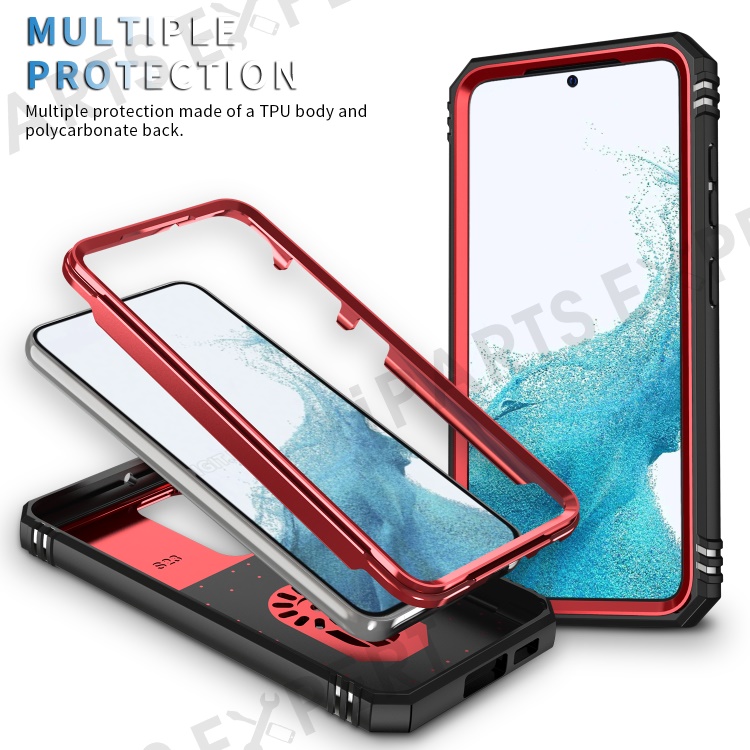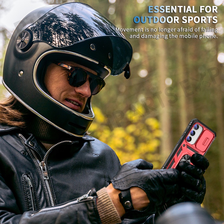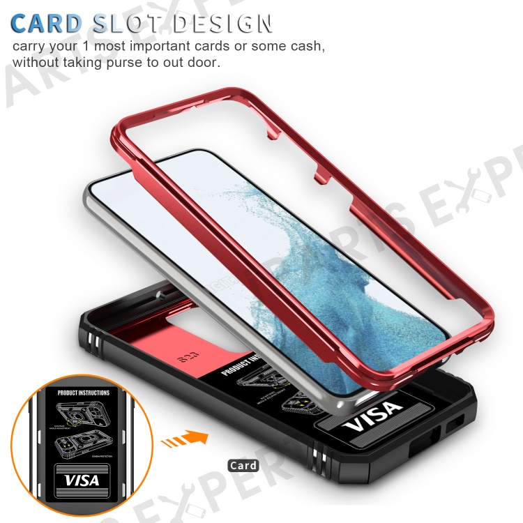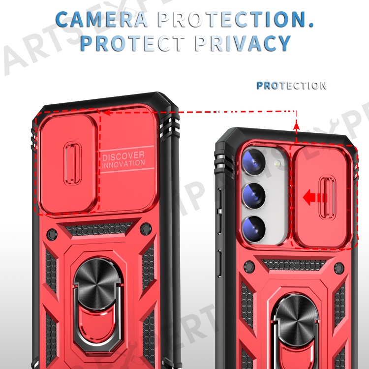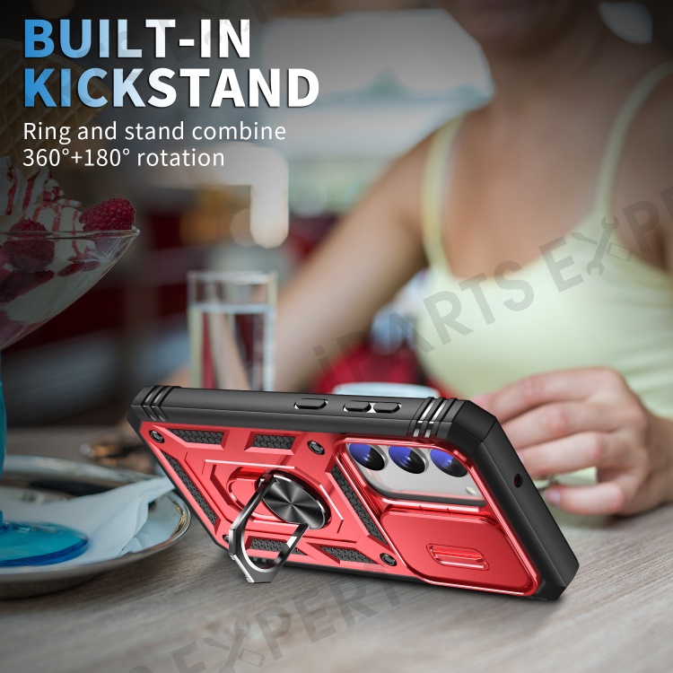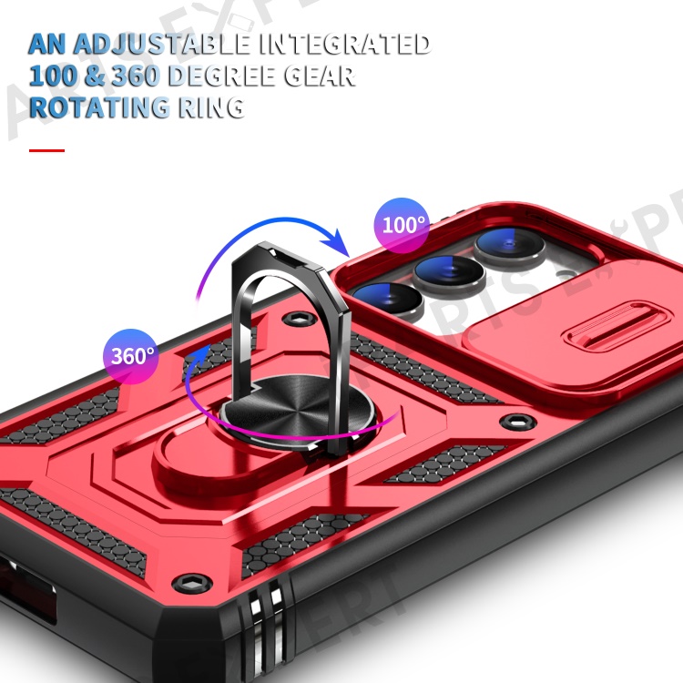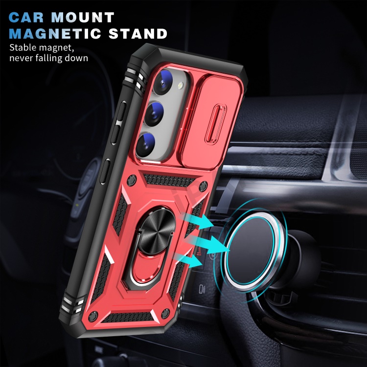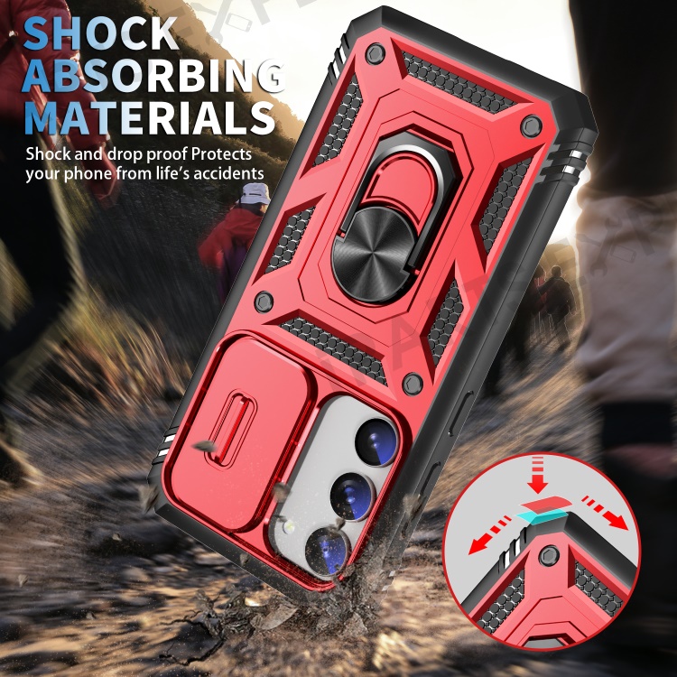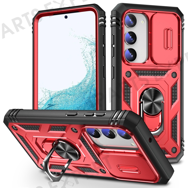 For Samsung Galaxy S23 Bump Proof Phone Case with Ring Kickstand Card Holder Phone Back Cover with Sliding Camera Lid - Black / Red