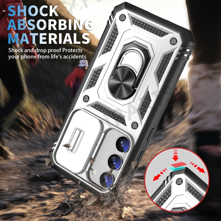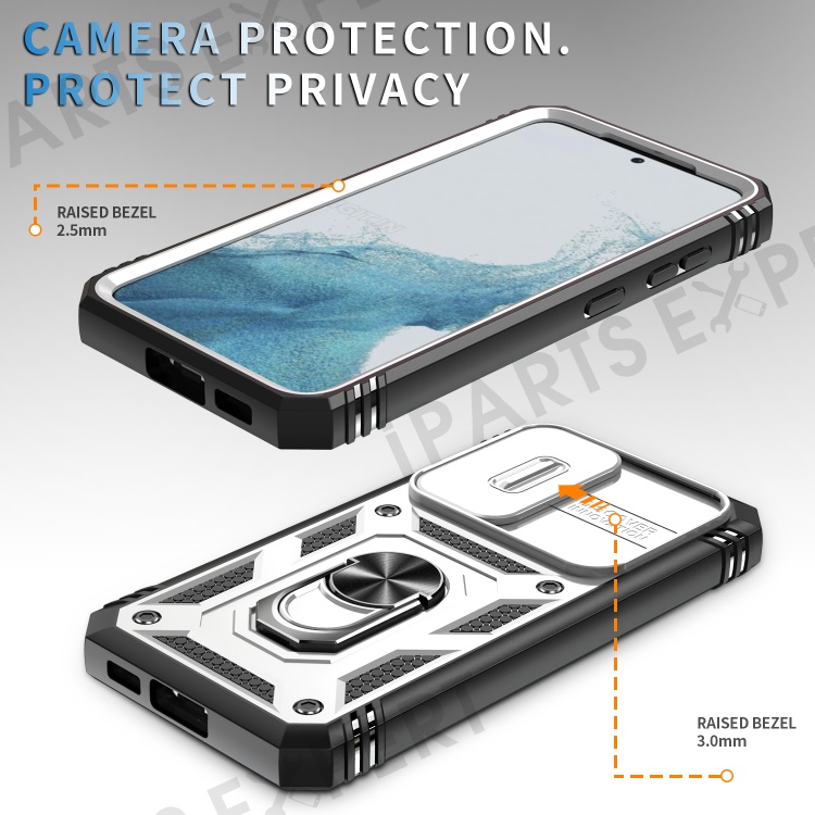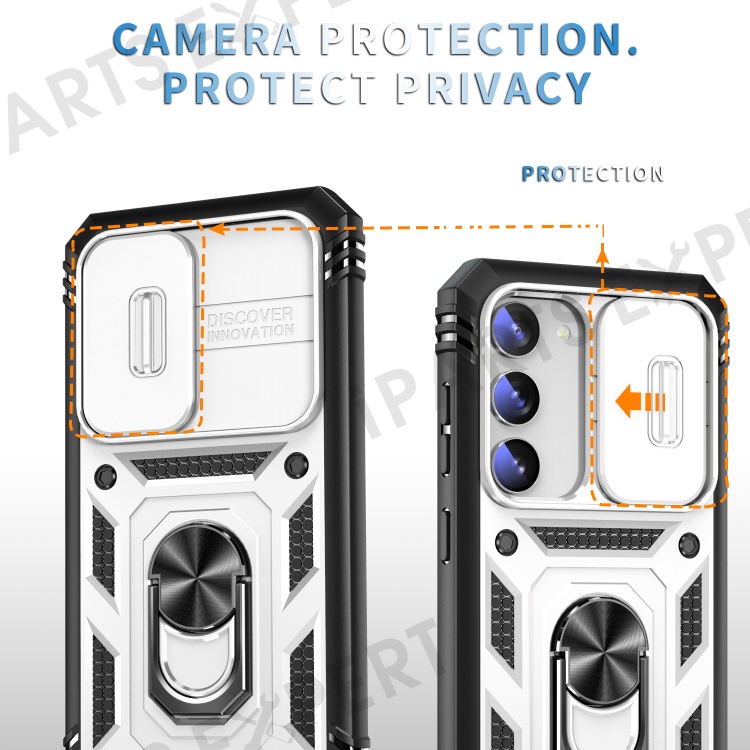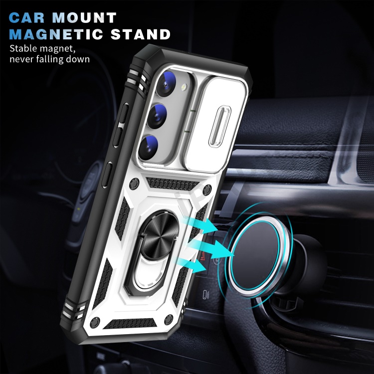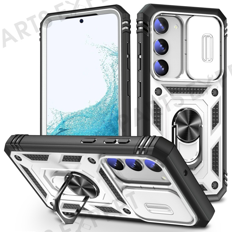 For Samsung Galaxy S23 Bump Proof Phone Case with Ring Kickstand Card Holder Phone Back Cover with Sliding Camera Lid - Black / White