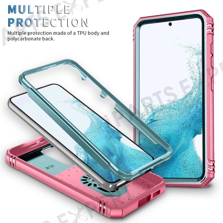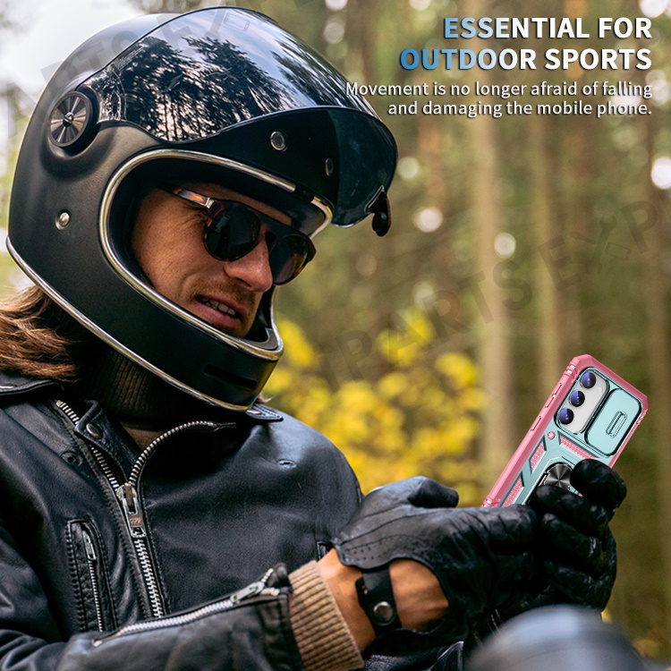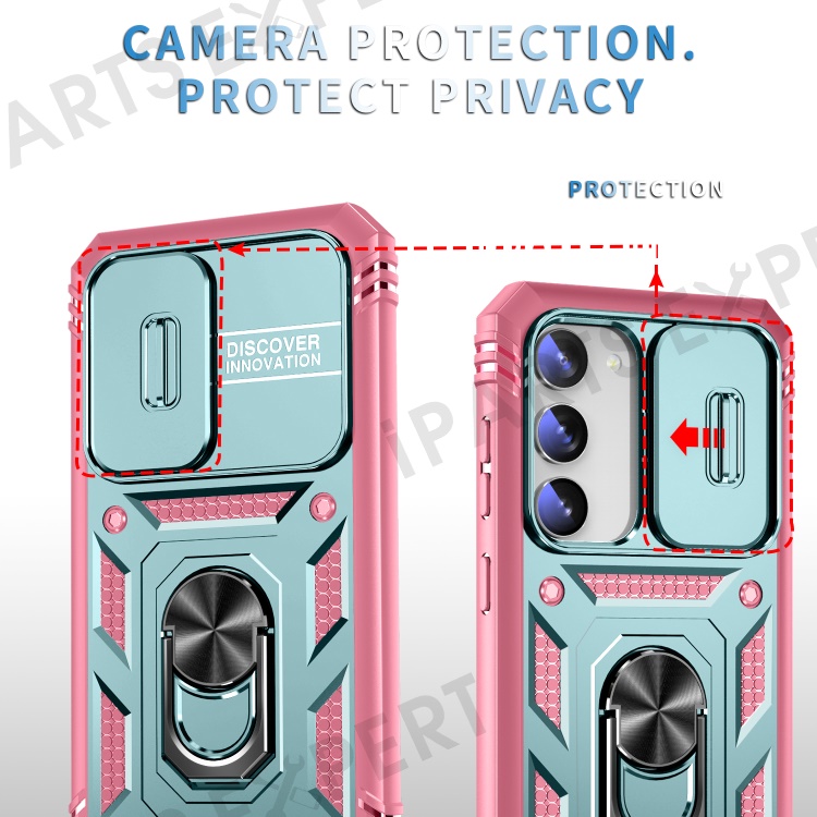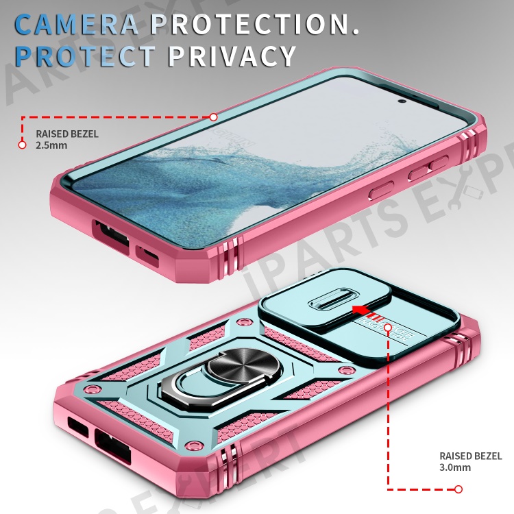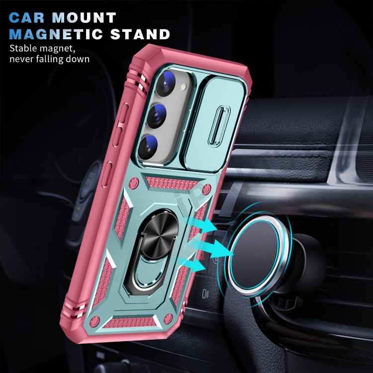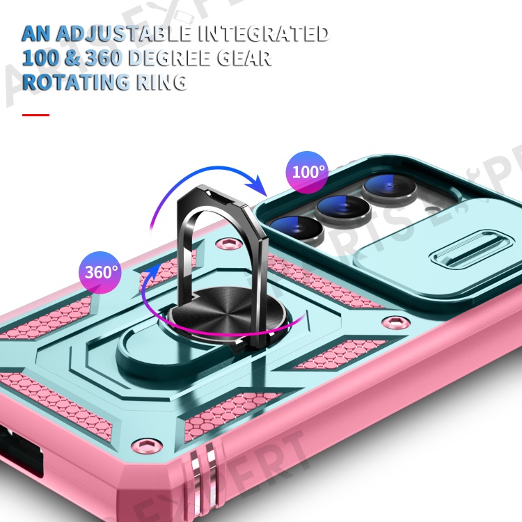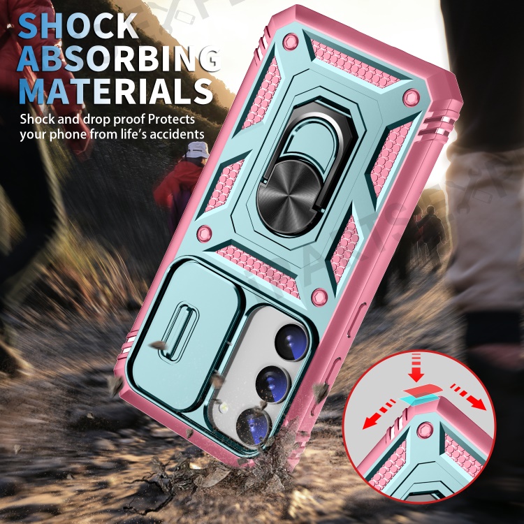 For Samsung Galaxy S23 Bump Proof Phone Case with Ring Kickstand Card Holder Phone Back Cover with Sliding Camera Lid - Green / Pink