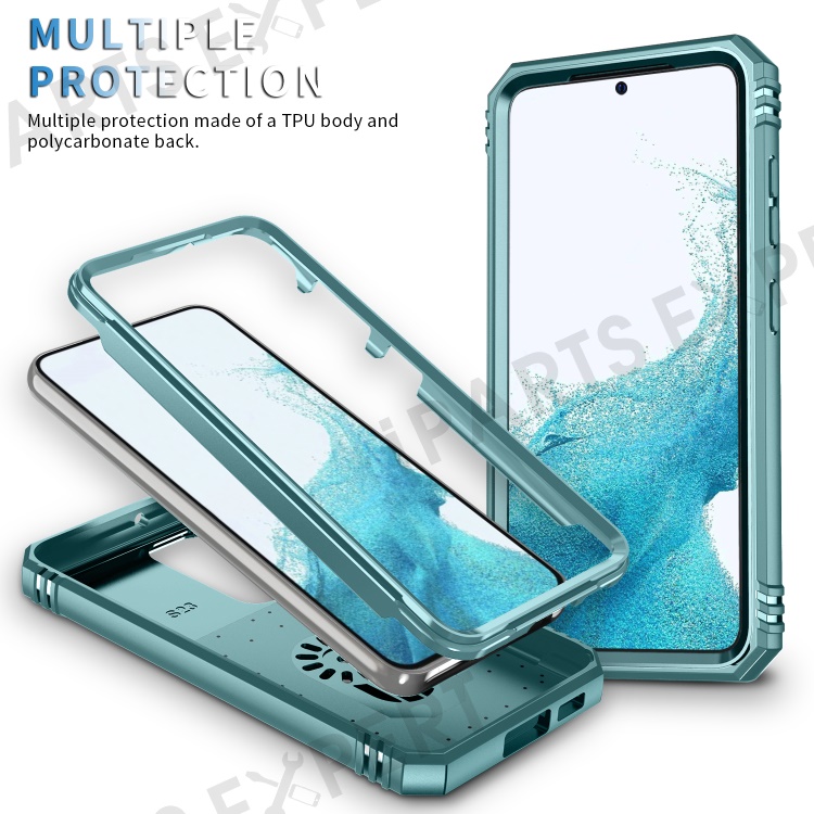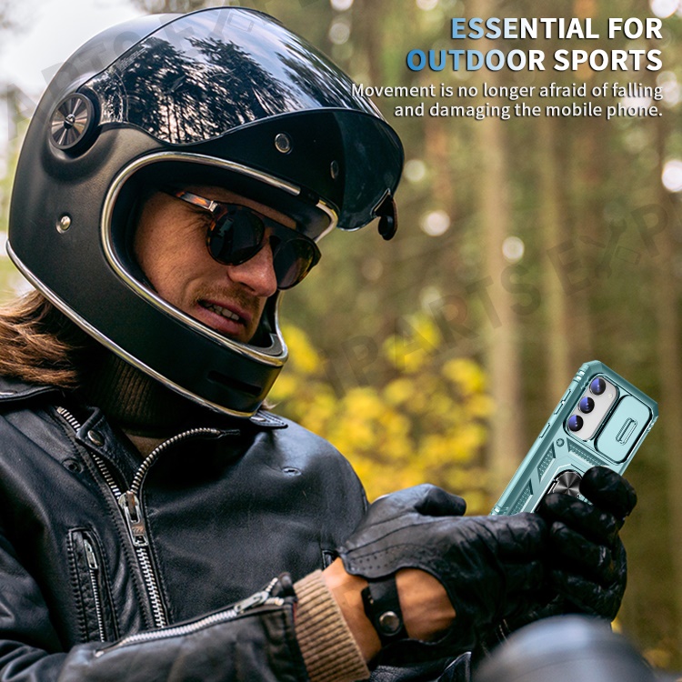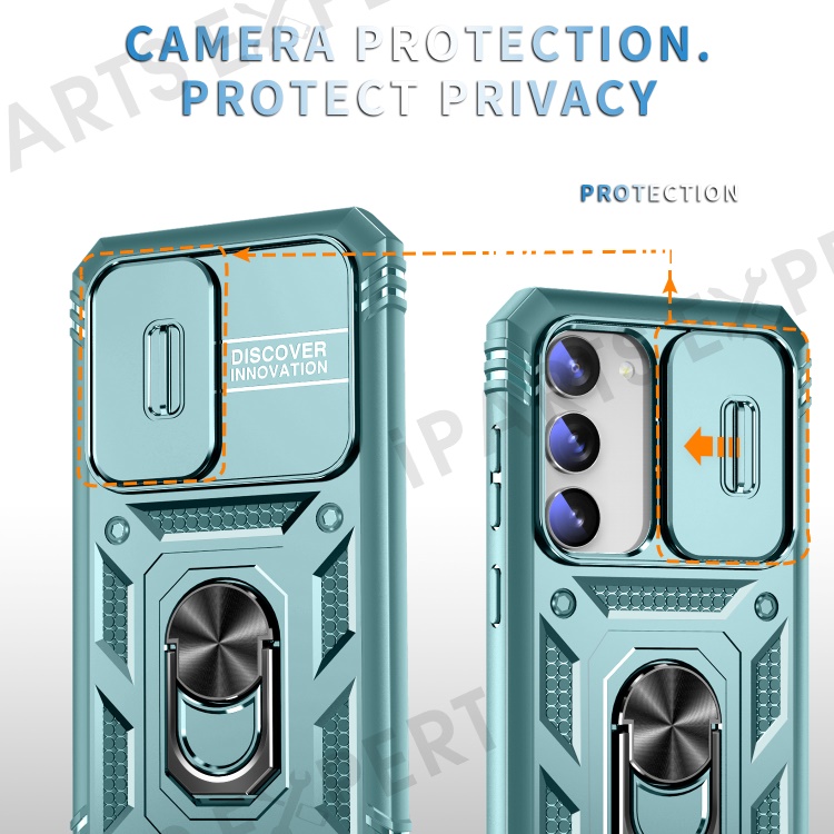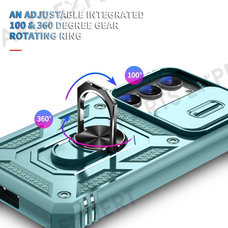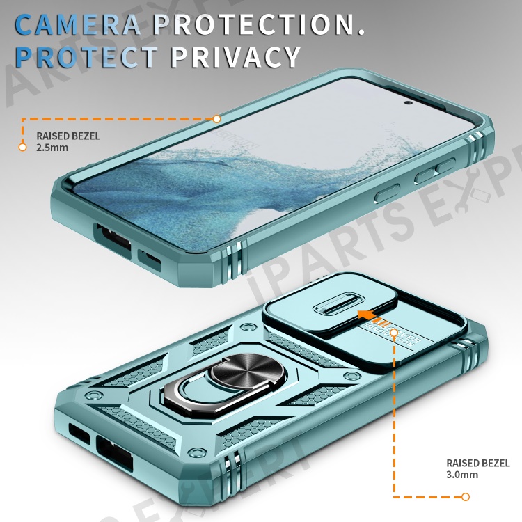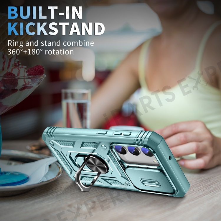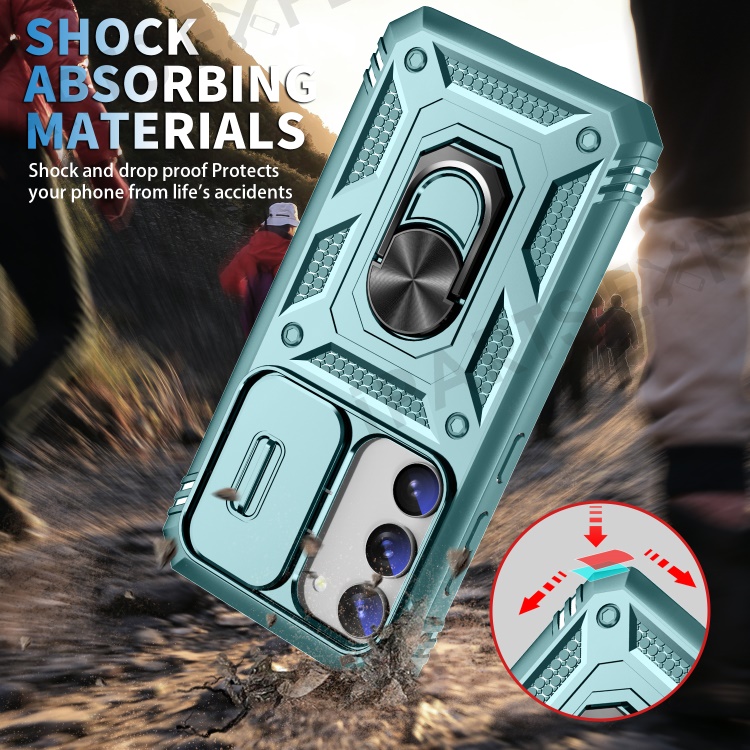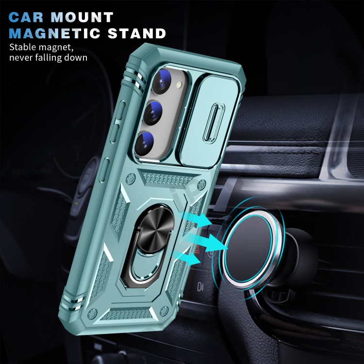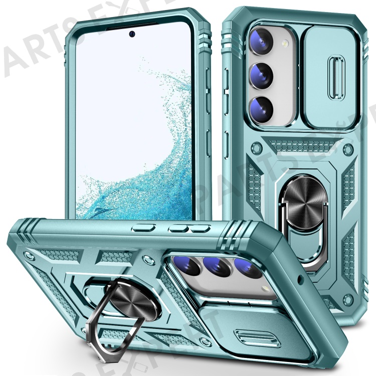 For Samsung Galaxy S23 Bump Proof Phone Case with Ring Kickstand Card Holder Phone Back Cover with Sliding Camera Lid - Green