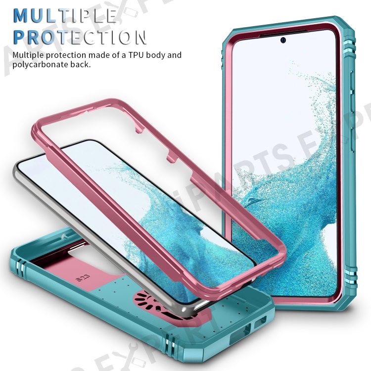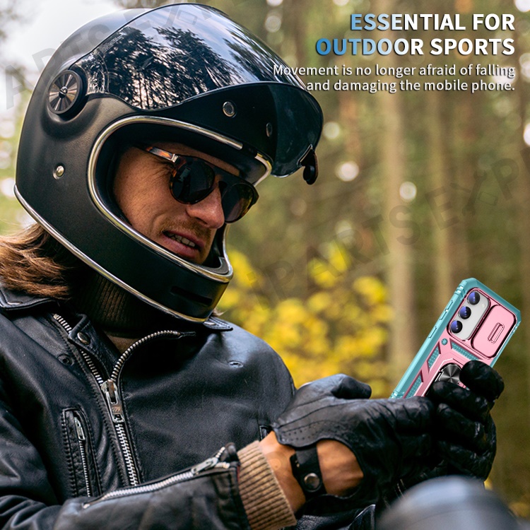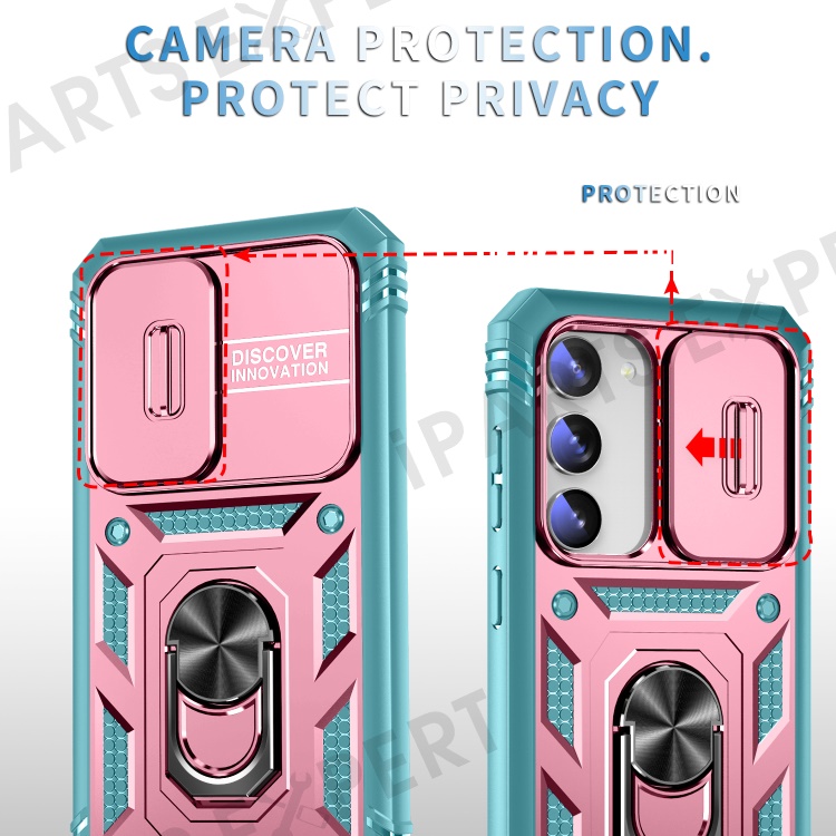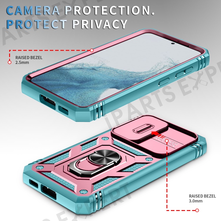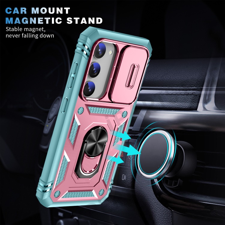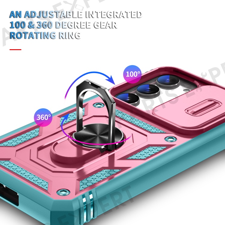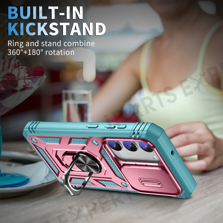 For Samsung Galaxy S23 Bump Proof Phone Case with Ring Kickstand Card Holder Phone Back Cover with Sliding Camera Lid - Pink / Green