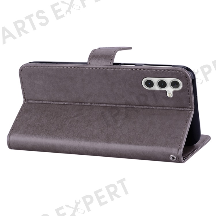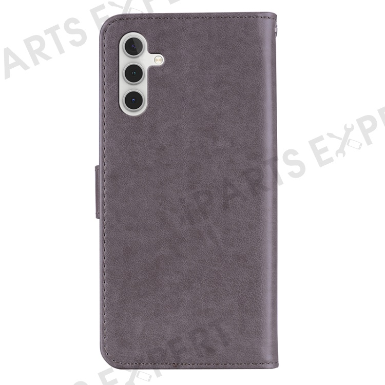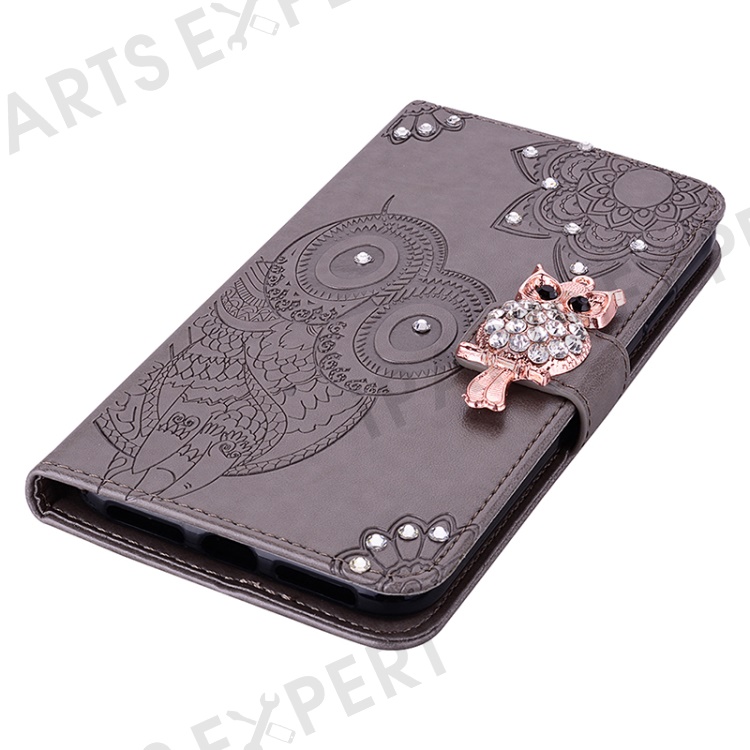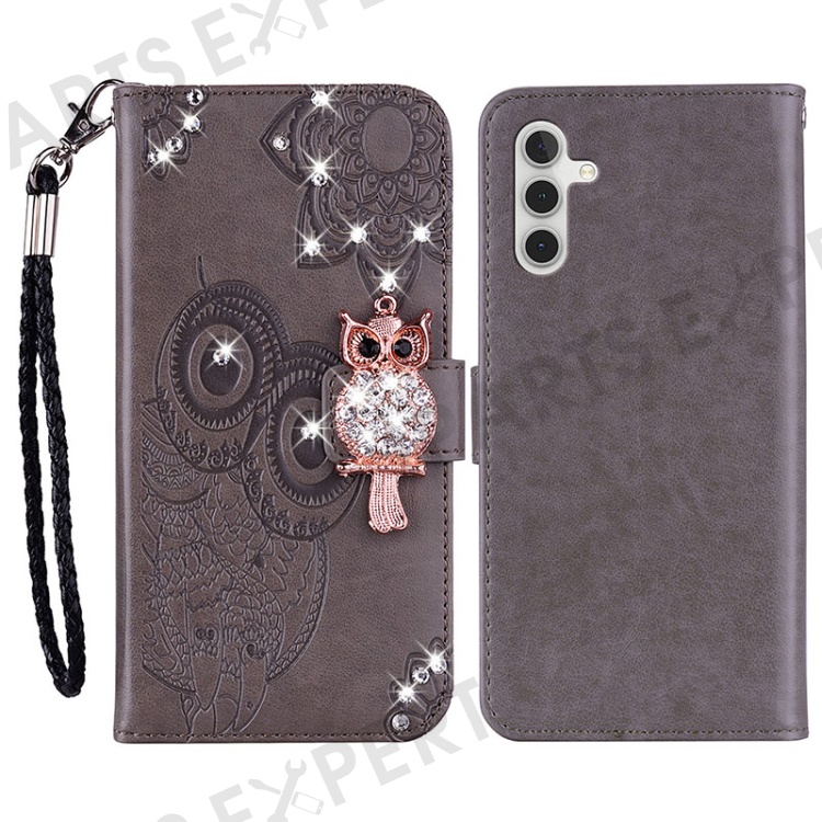 For Samsung Galaxy S23 FE Case Owl Flower Imprinted Rhinestone Leather Phone Stand Cover - Grey