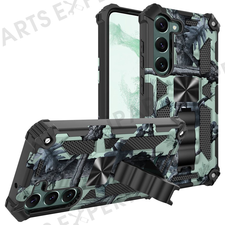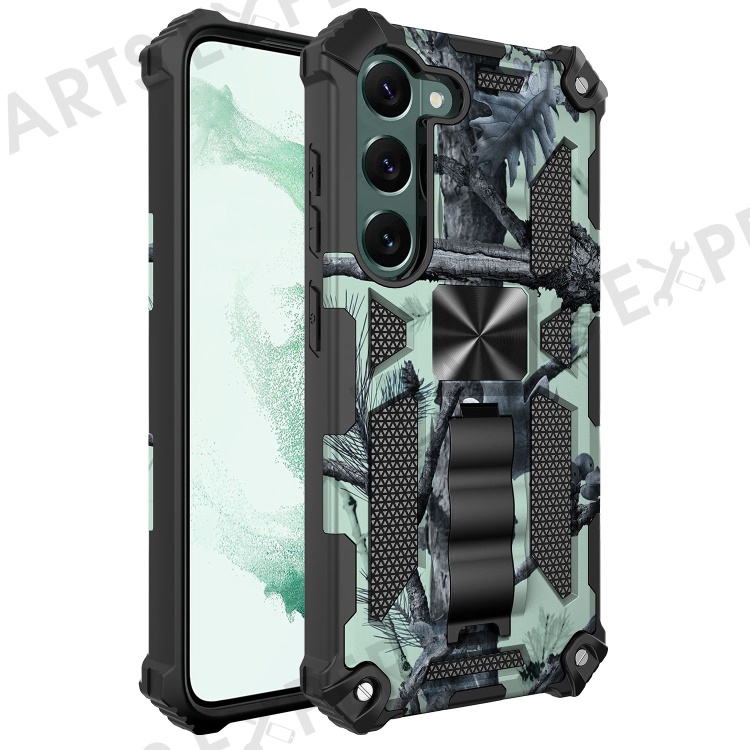 For Samsung Galaxy S23+ Camouflage Design Military Grade Drop Protective Cover Soft TPU Hard PC Kickstand Tough Phone Case - Light Green