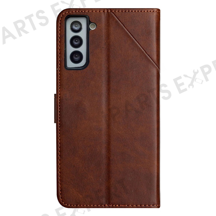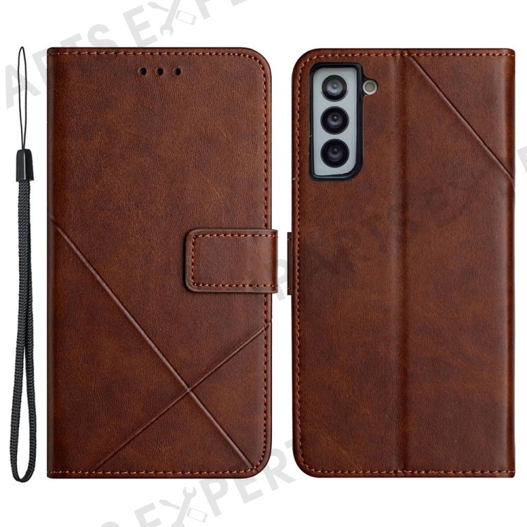 For Samsung Galaxy S23+ Drop-proof Line Imprinting Phone Case Solid Color PU Leather Magnetic Clasp Wallet Stand Flip Cover with Strap - Brown