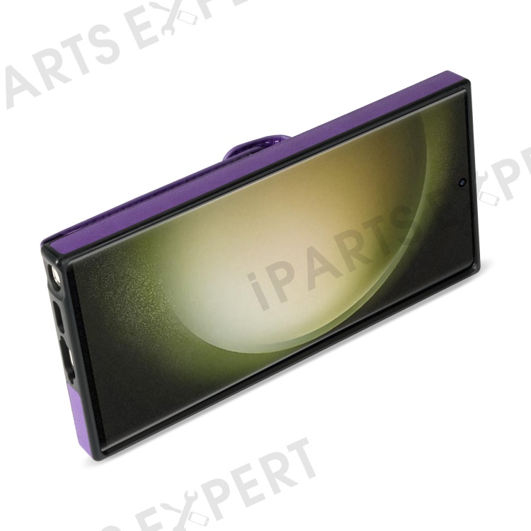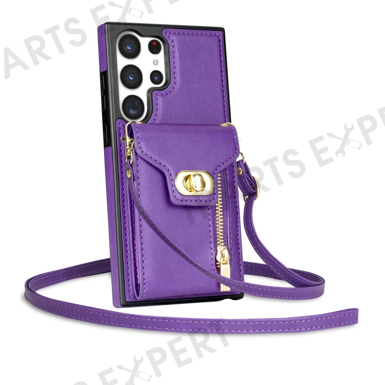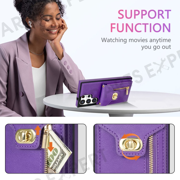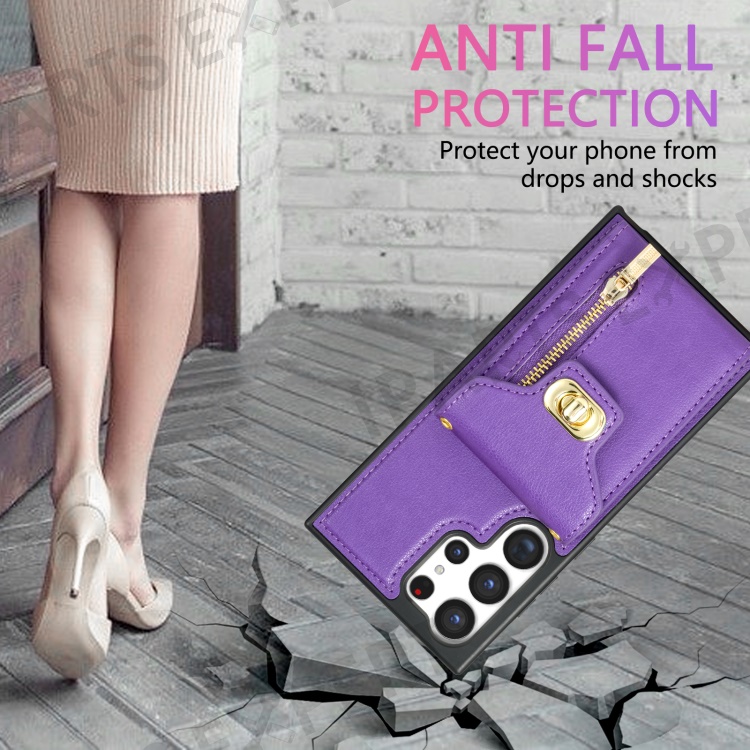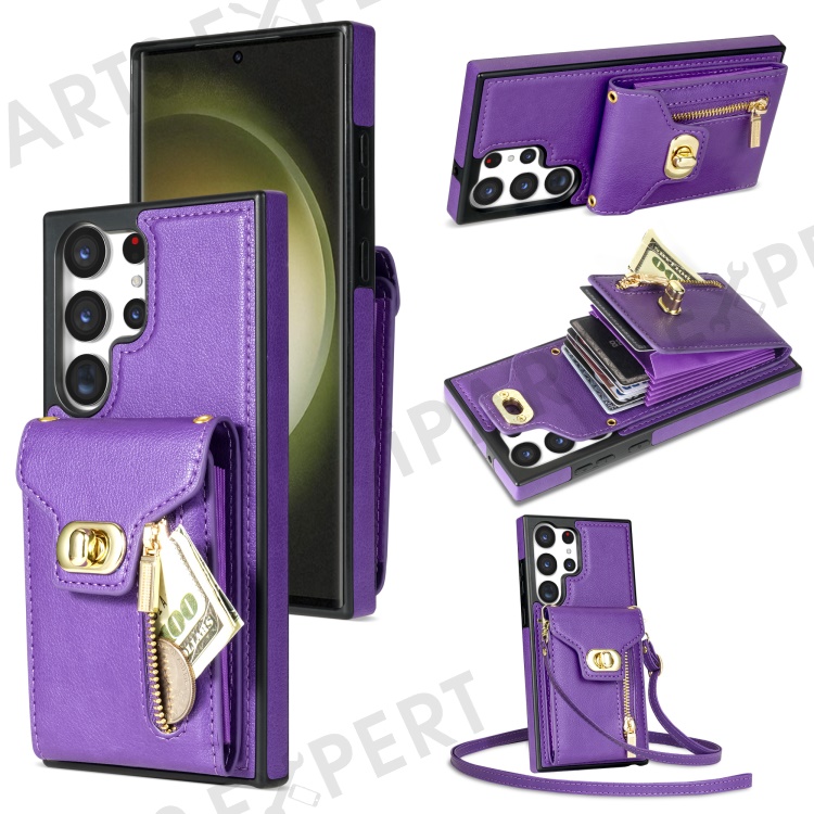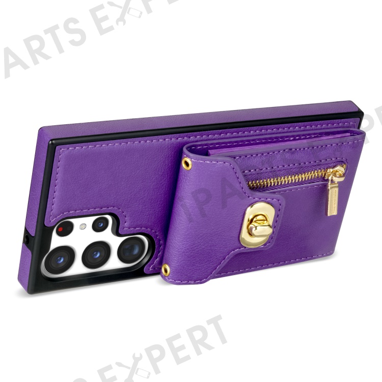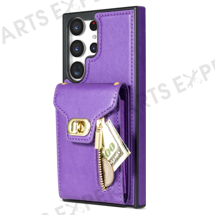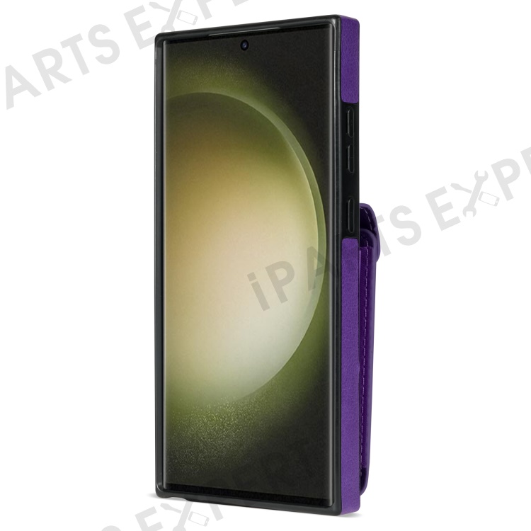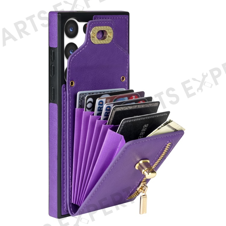 For Samsung Galaxy S23 Ultra Card Slots Phone Cover Zipper Pocket Leather Coated TPU Kickstand Case - Purple