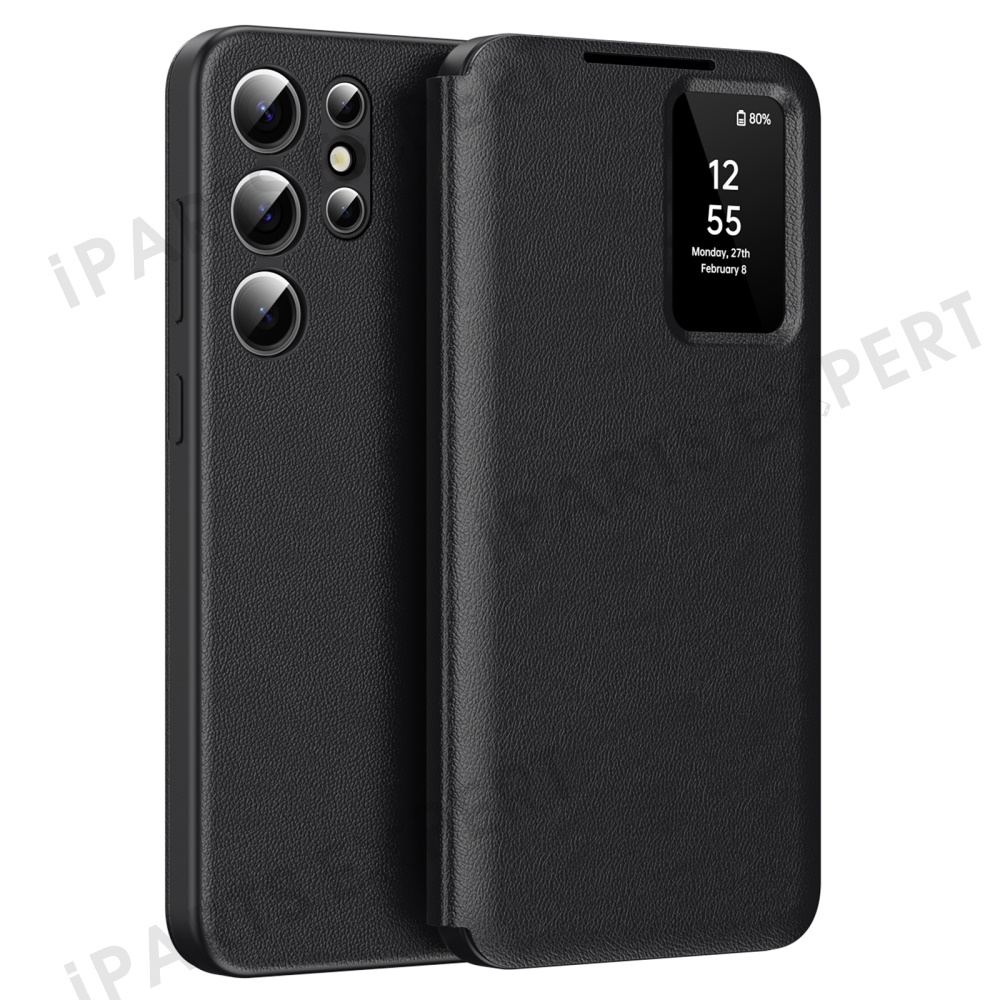 For Samsung Galaxy S23 Ultra Case Leather Phone Cover with View Window Card Slot - Black