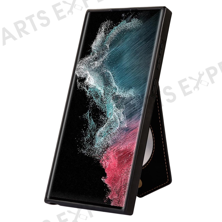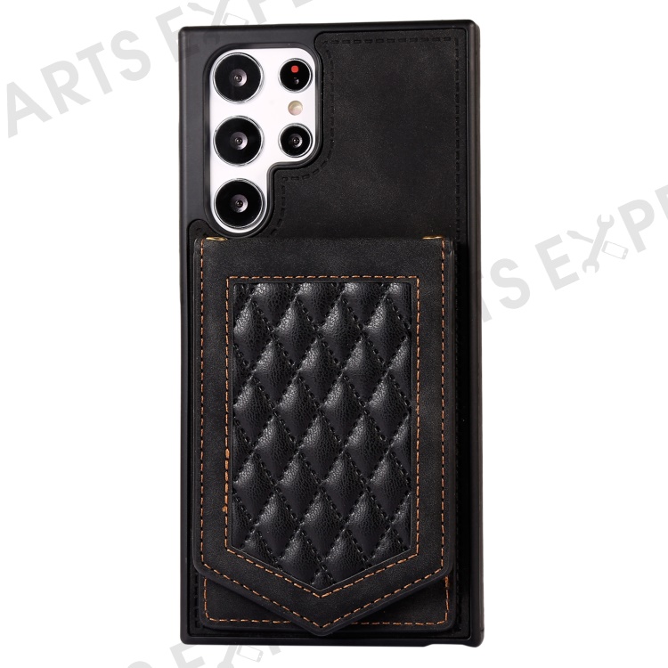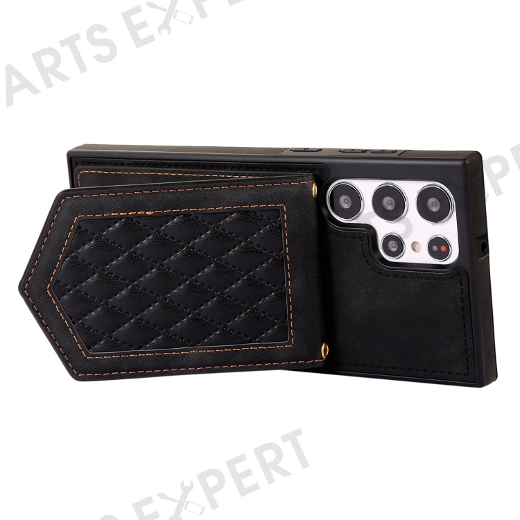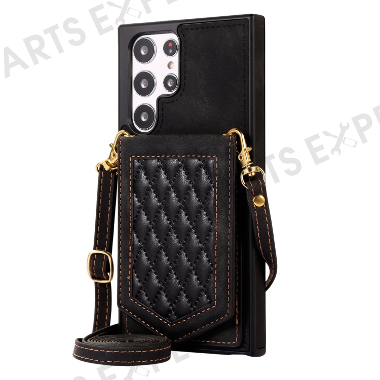 For Samsung Galaxy S23 Ultra Imprinted PU Leather Coated TPU Kickstand Case Anti-drop RFID Blocking Card Holder Phone Cover with Shoulder Strap - Black