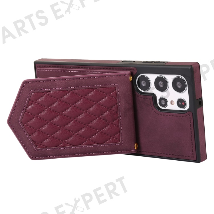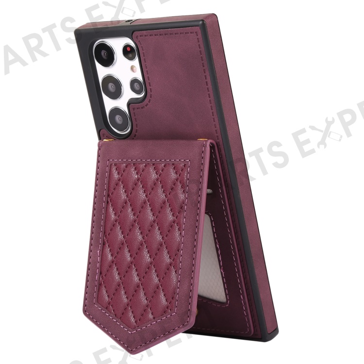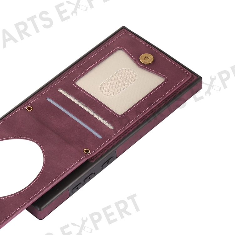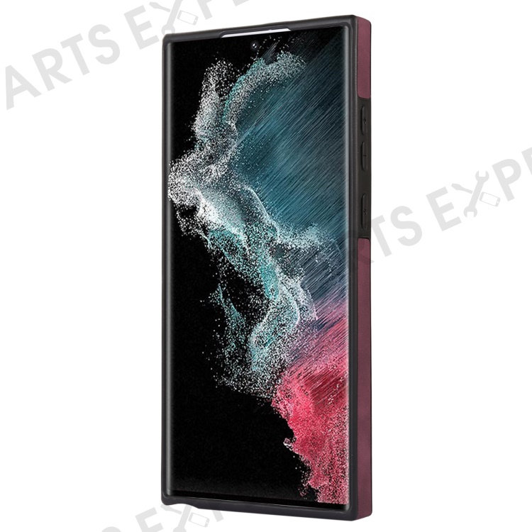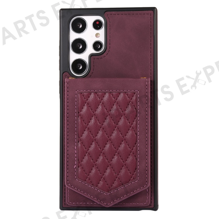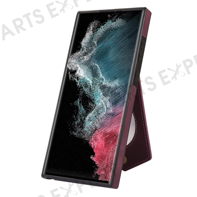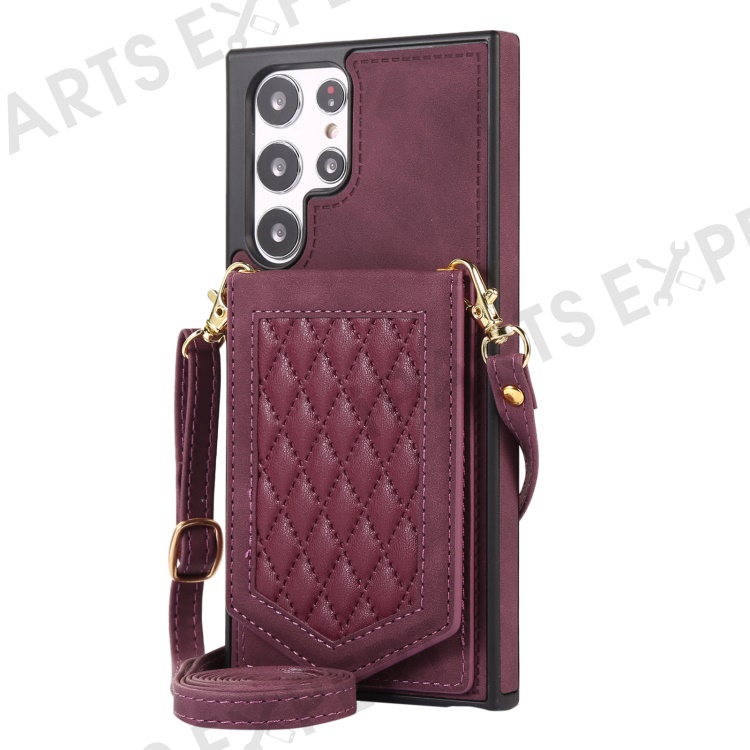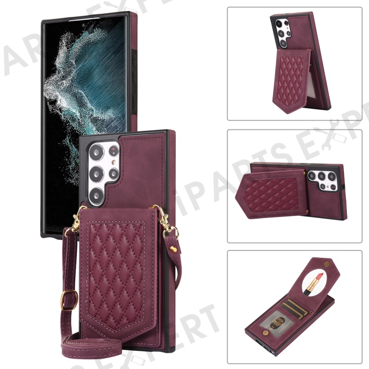 For Samsung Galaxy S23 Ultra Imprinted PU Leather Coated TPU Kickstand Case Anti-drop RFID Blocking Card Holder Phone Cover with Shoulder Strap - Wine Red