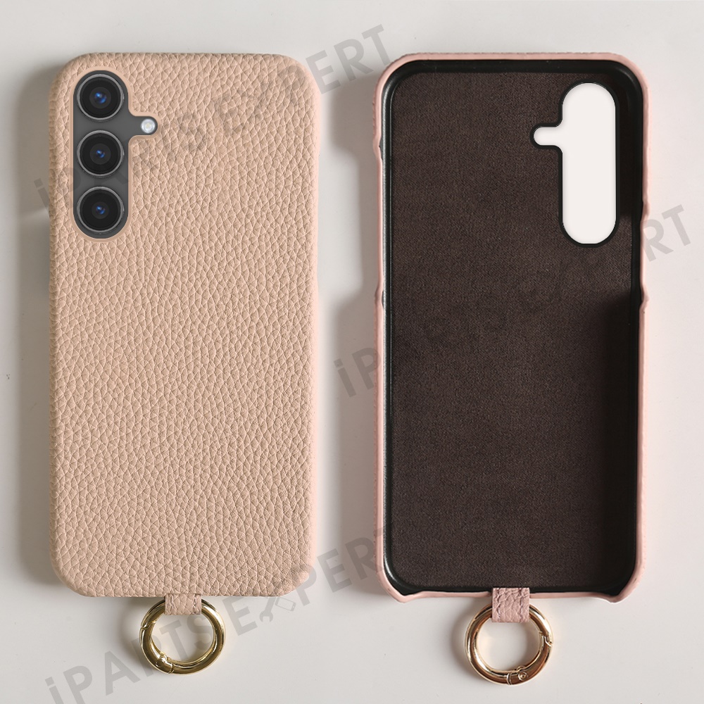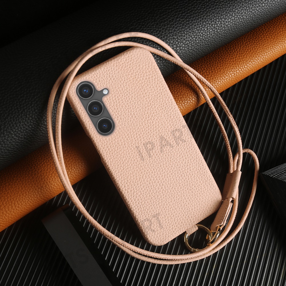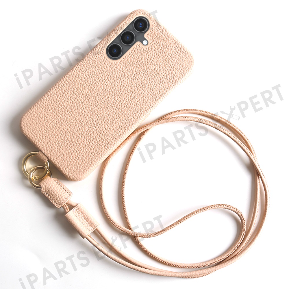For Samsung Galaxy S24 Case with Lanyard Genuine Cow Leather PC Phone Back Cover - Pink