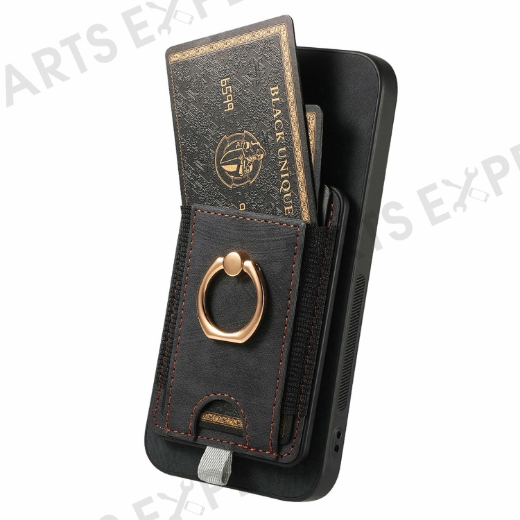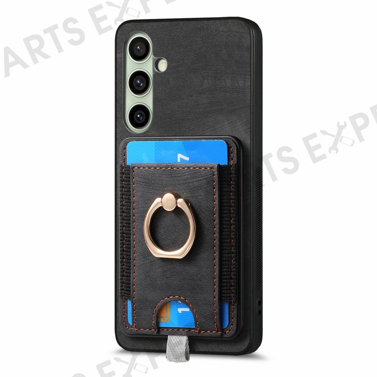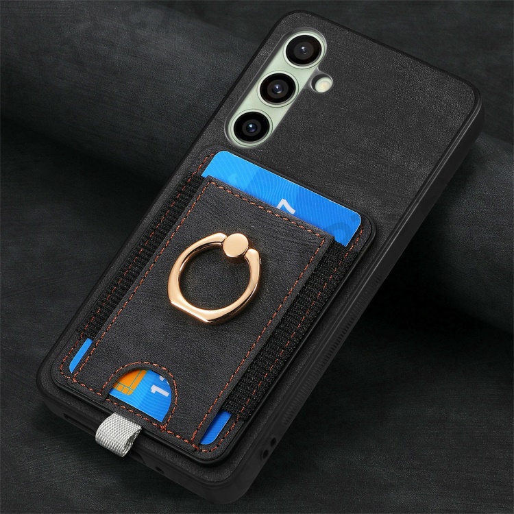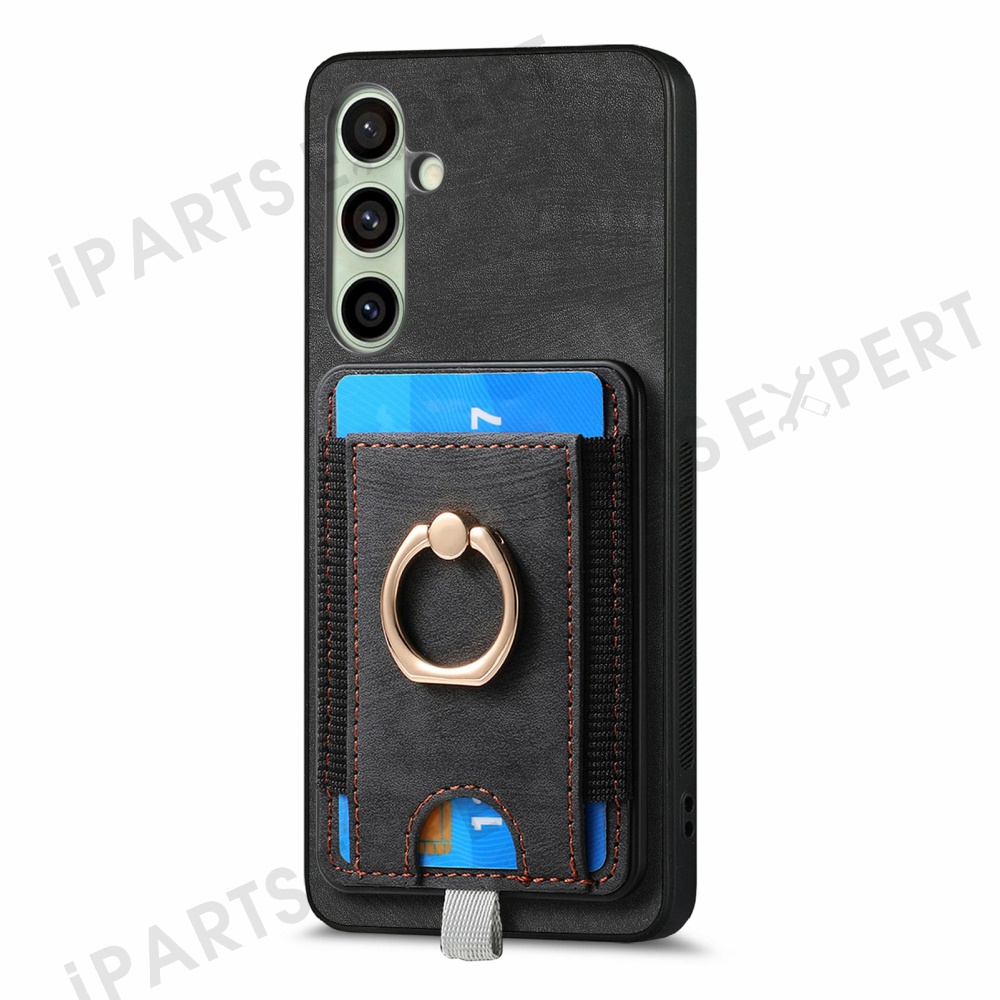 For Samsung Galaxy S24 FE Magnetic Case Card Holder Ring Kickstand PU Leather Phone Back Cover - Black
