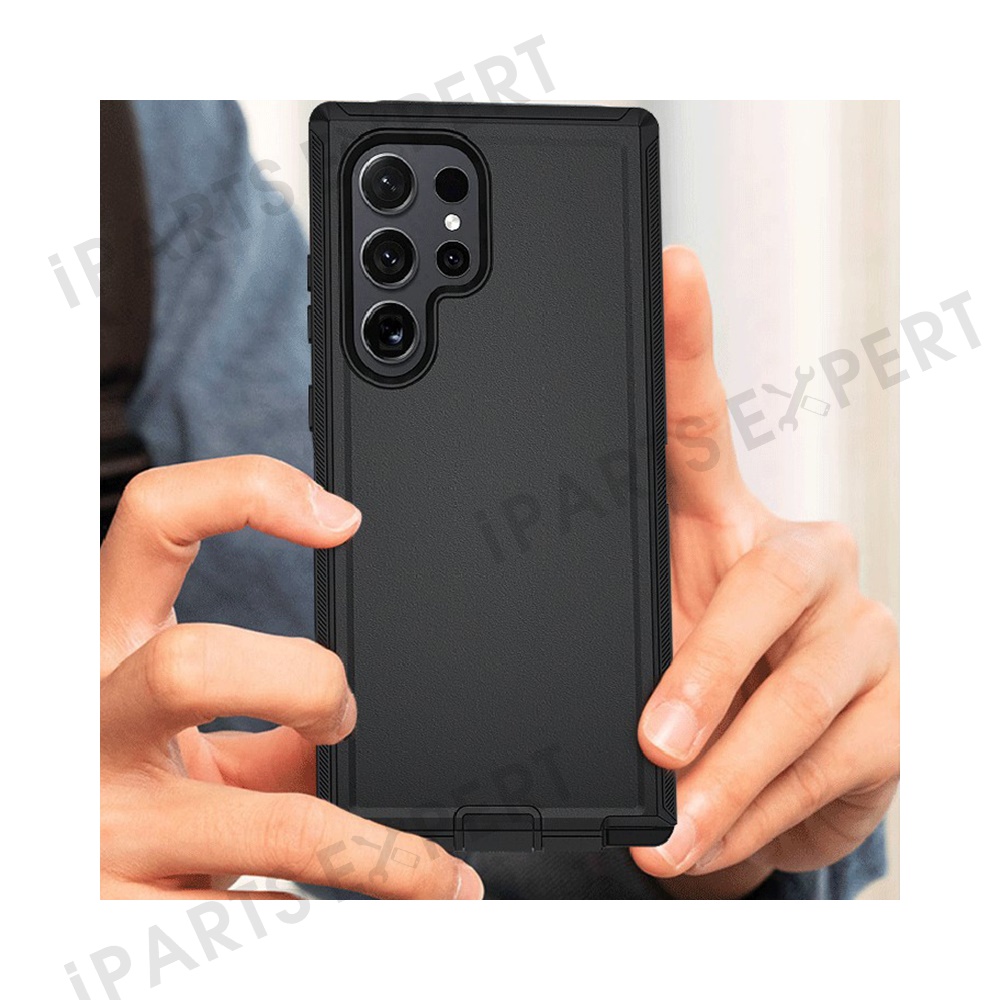 - 2. Put the phone into the bottom of the back cover of the protective case and put on the interface dustproof cover