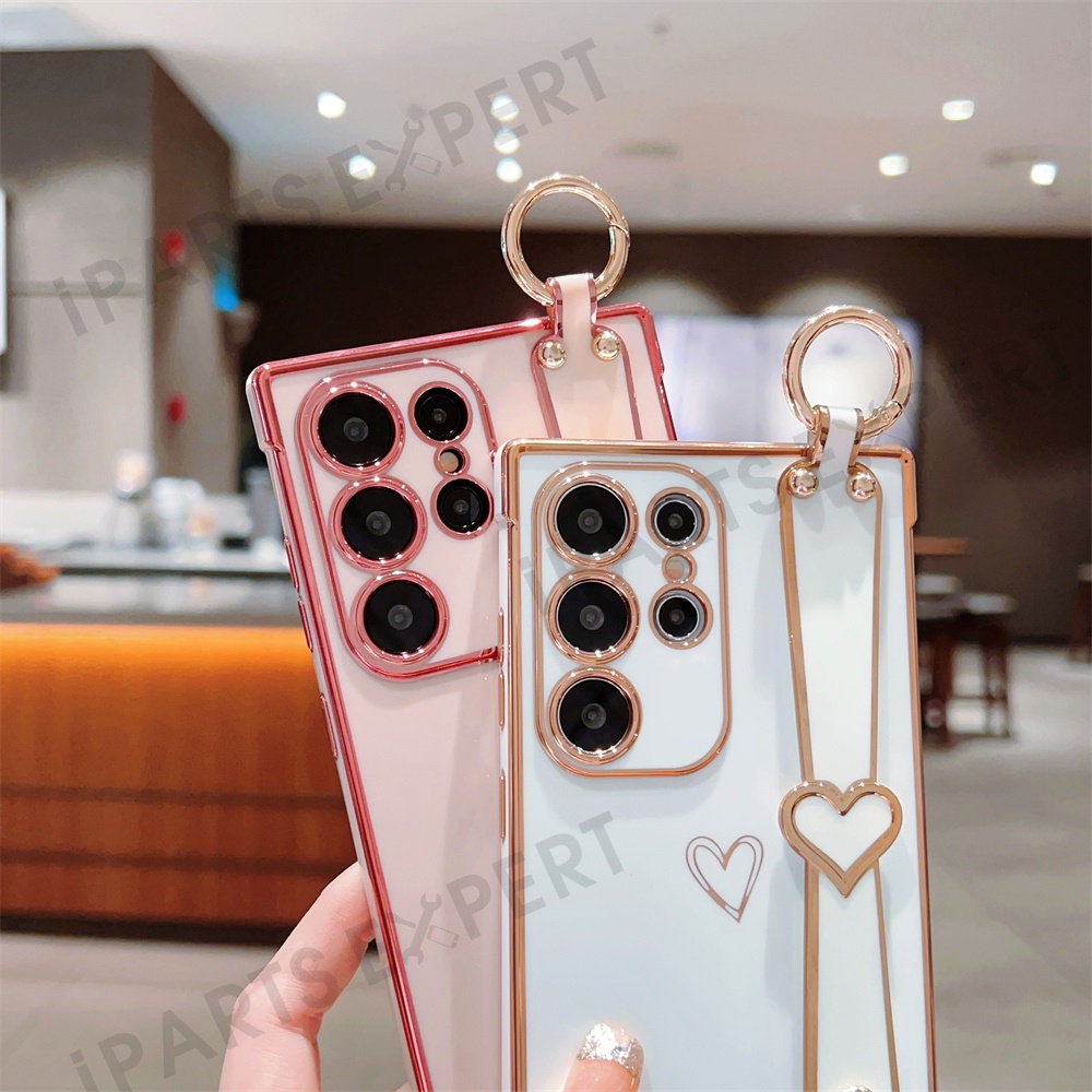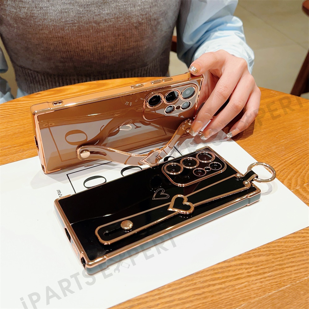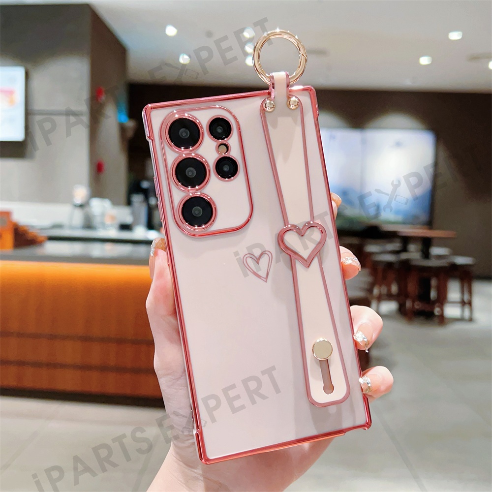 For Samsung Galaxy S24 Ultra Case Electroplated Heart Pattern TPU Phone Back Cover with Wristband Kickstand - Pink