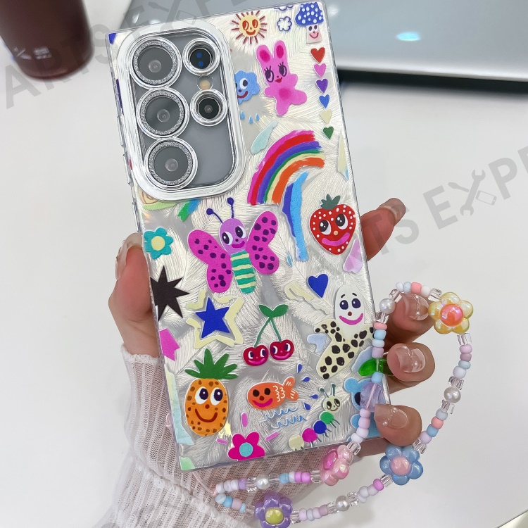 For Samsung Galaxy S24 Ultra Case IMD Cartoon PC+TPU Back Cover with Glass Lens Film, Beaded Strap - MK2