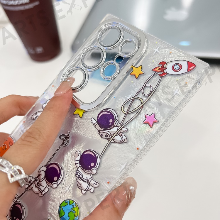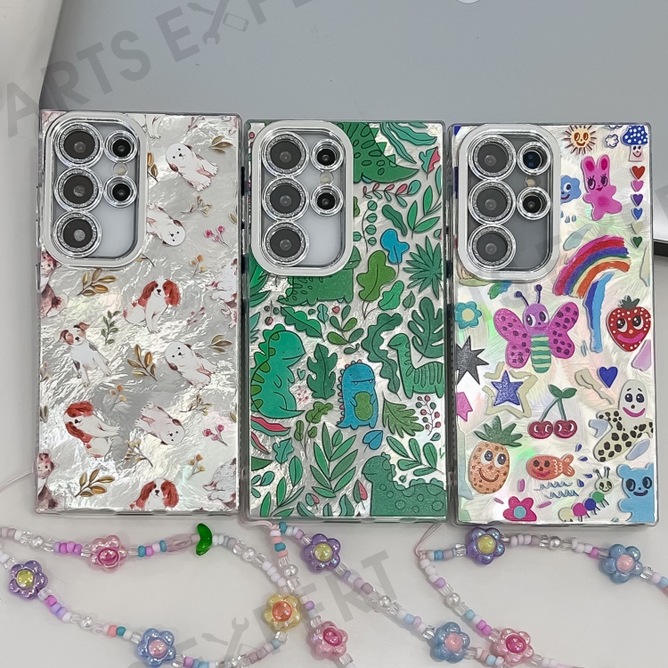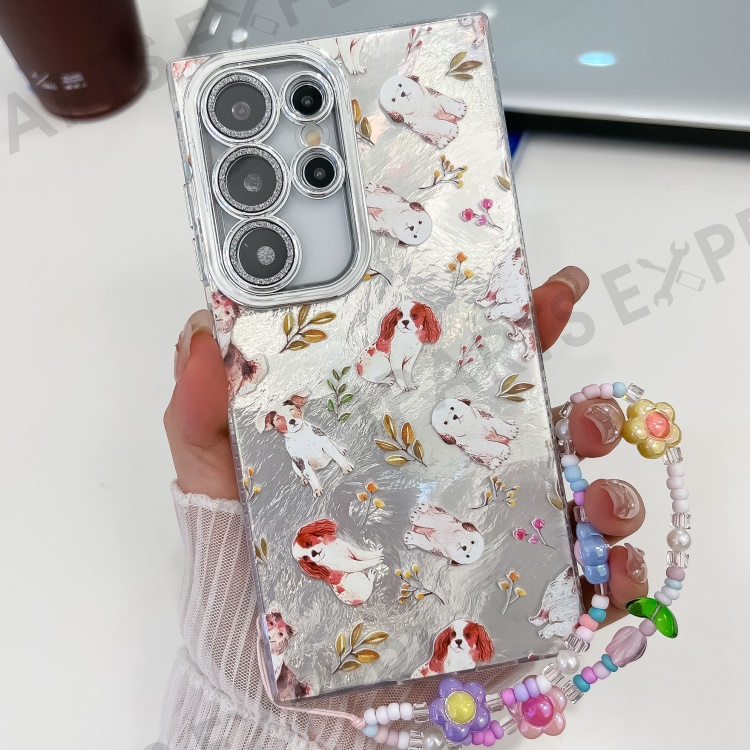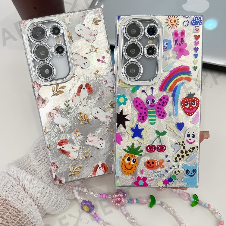 For Samsung Galaxy S24 Ultra Case IMD Cartoon PC+TPU Back Cover with Glass Lens Film, Beaded Strap - MK3