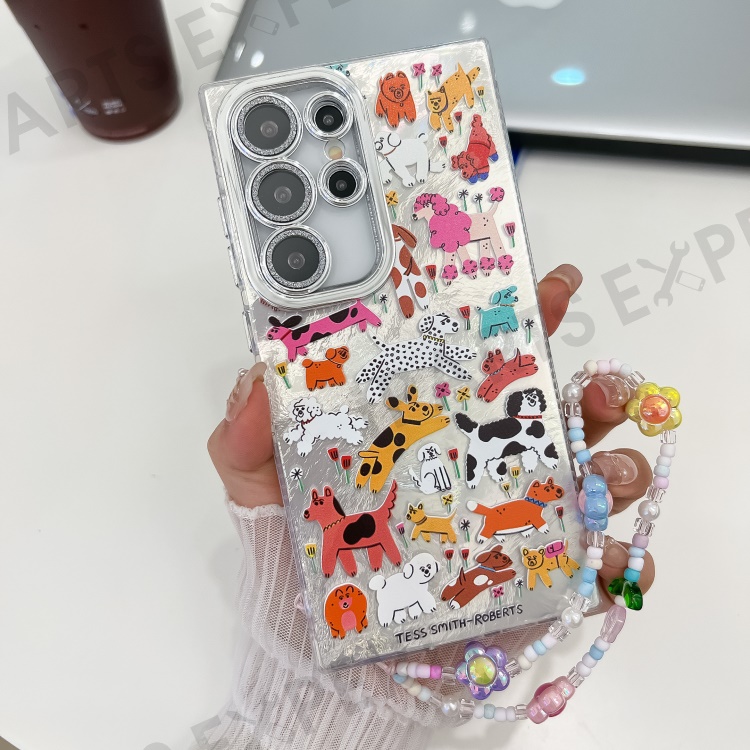 For Samsung Galaxy S24 Ultra Case IMD Cartoon PC+TPU Back Cover with Glass Lens Film, Beaded Strap - MK6
