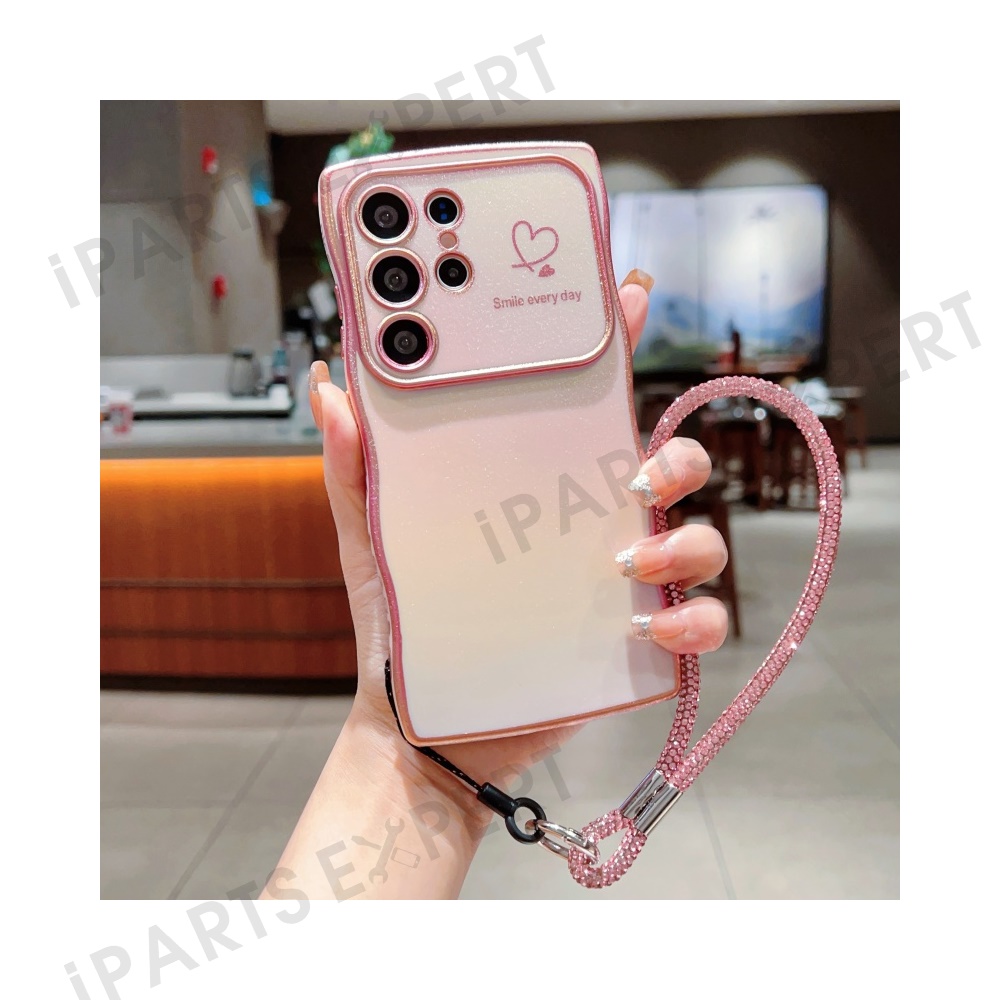 For Samsung Galaxy S24 Ultra Case with Strap TPU Phone Back Cover Dazzling Design Curly Shape Love Heart - Colorful Pink