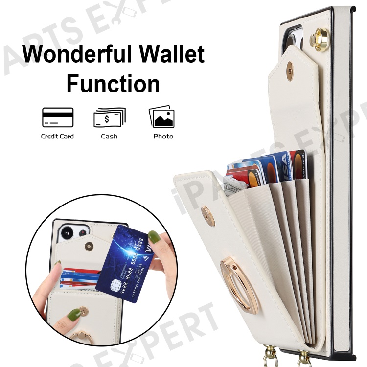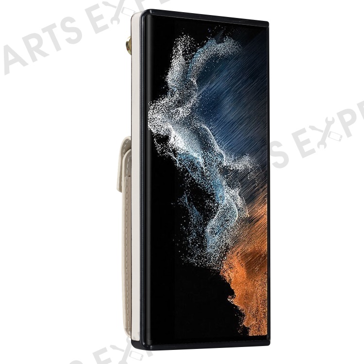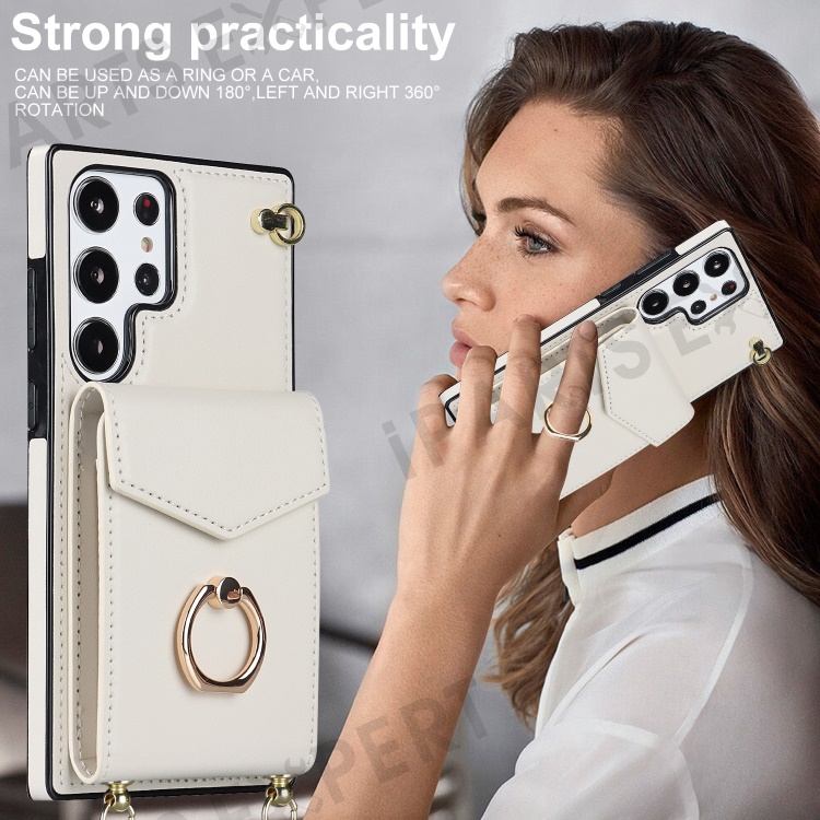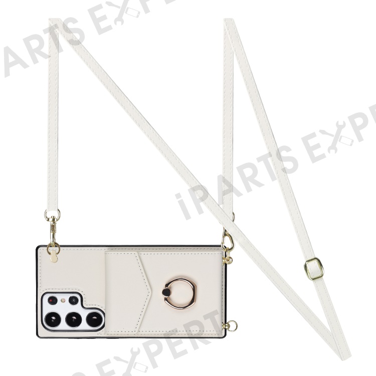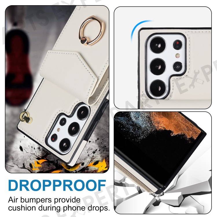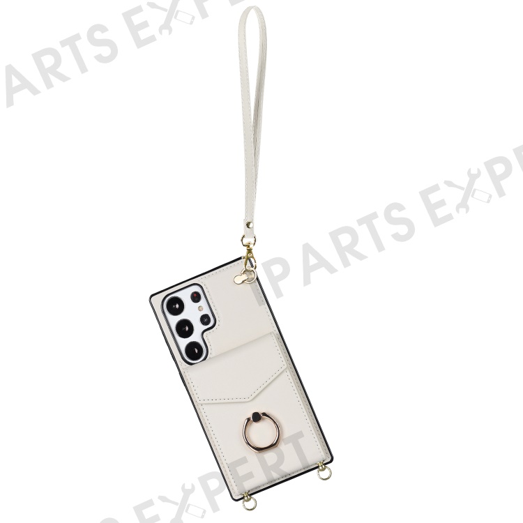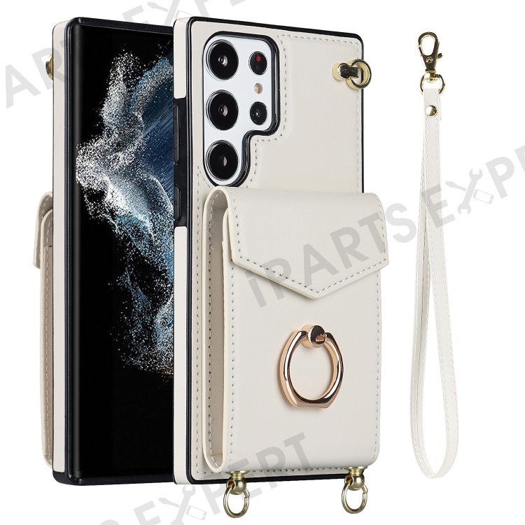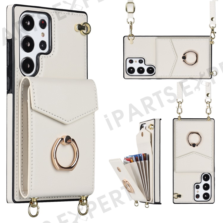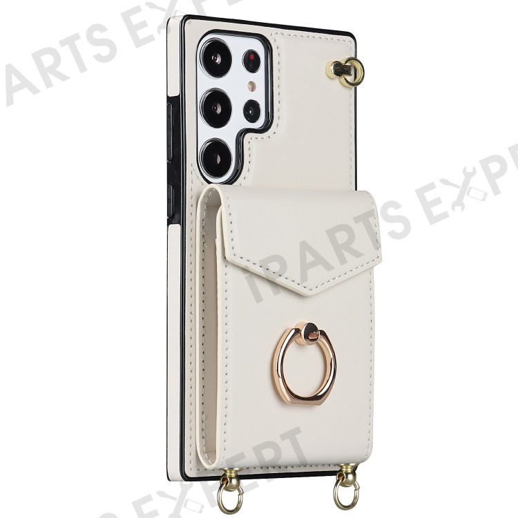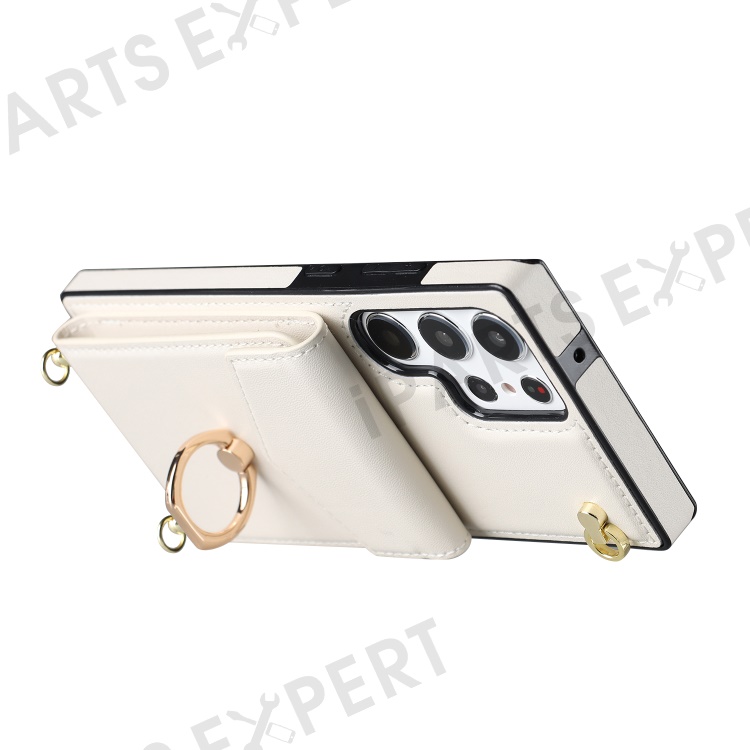 For Samsung Galaxy S24 Ultra Cell Phone Case Accordion Card Bag Ring Kickstand Back Cover - Beige