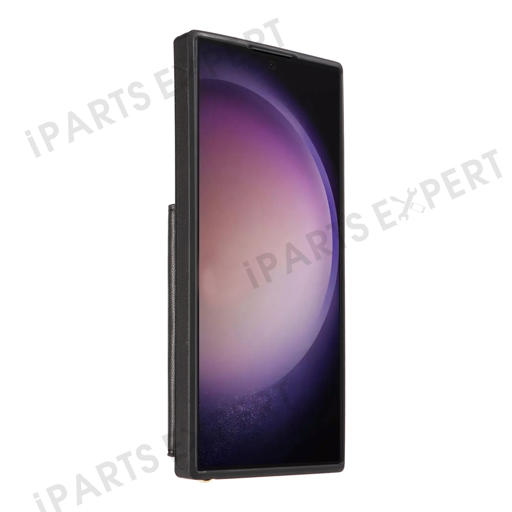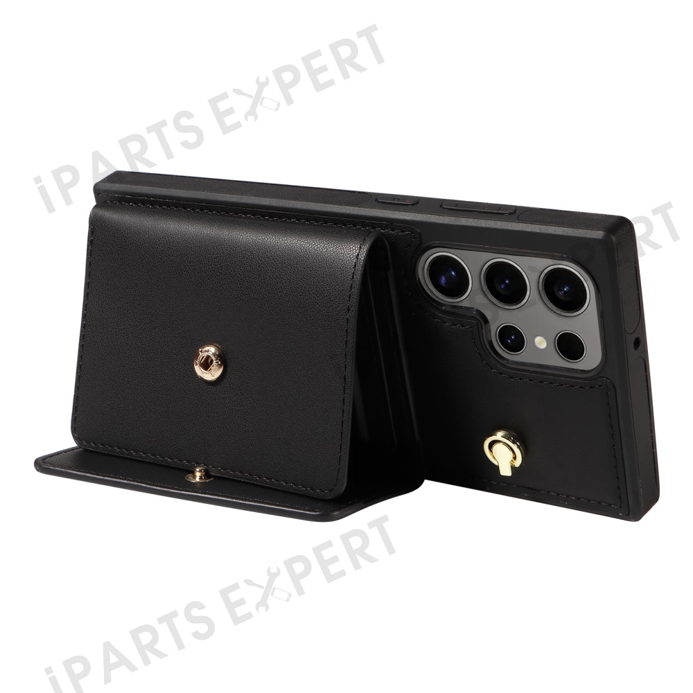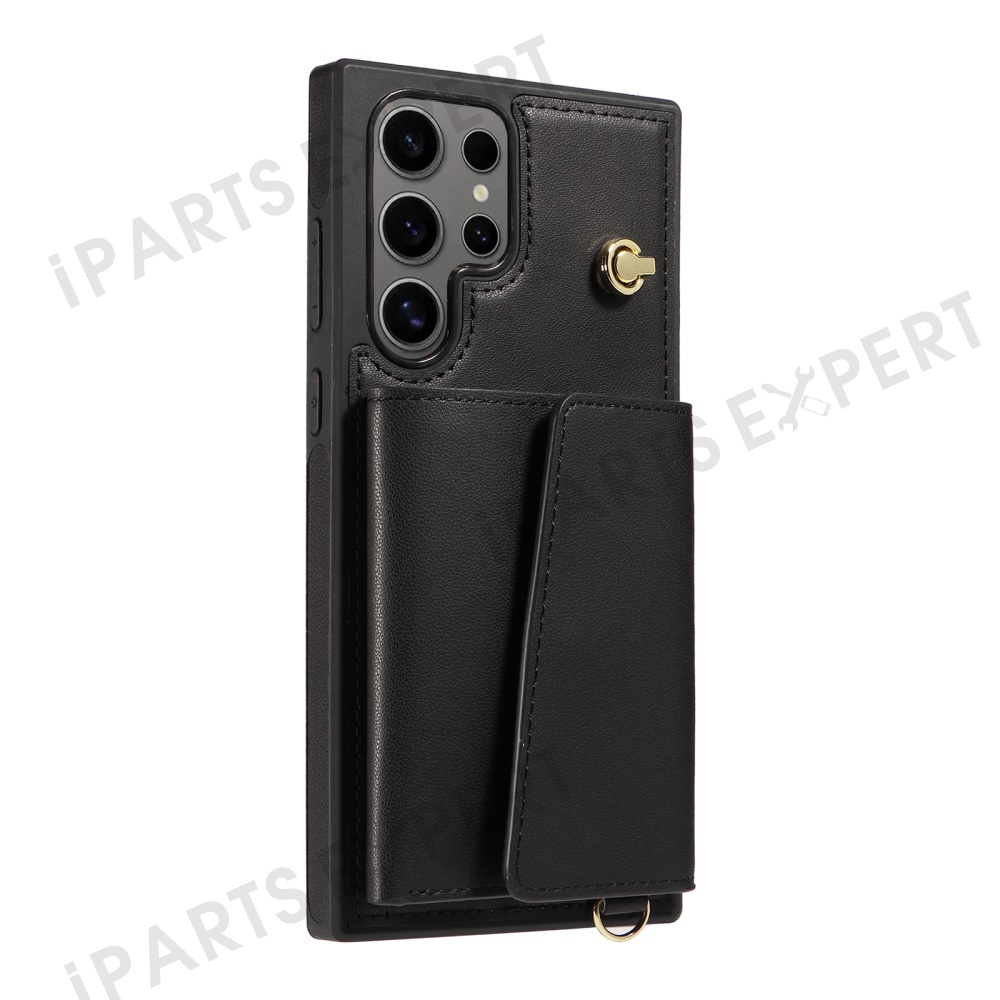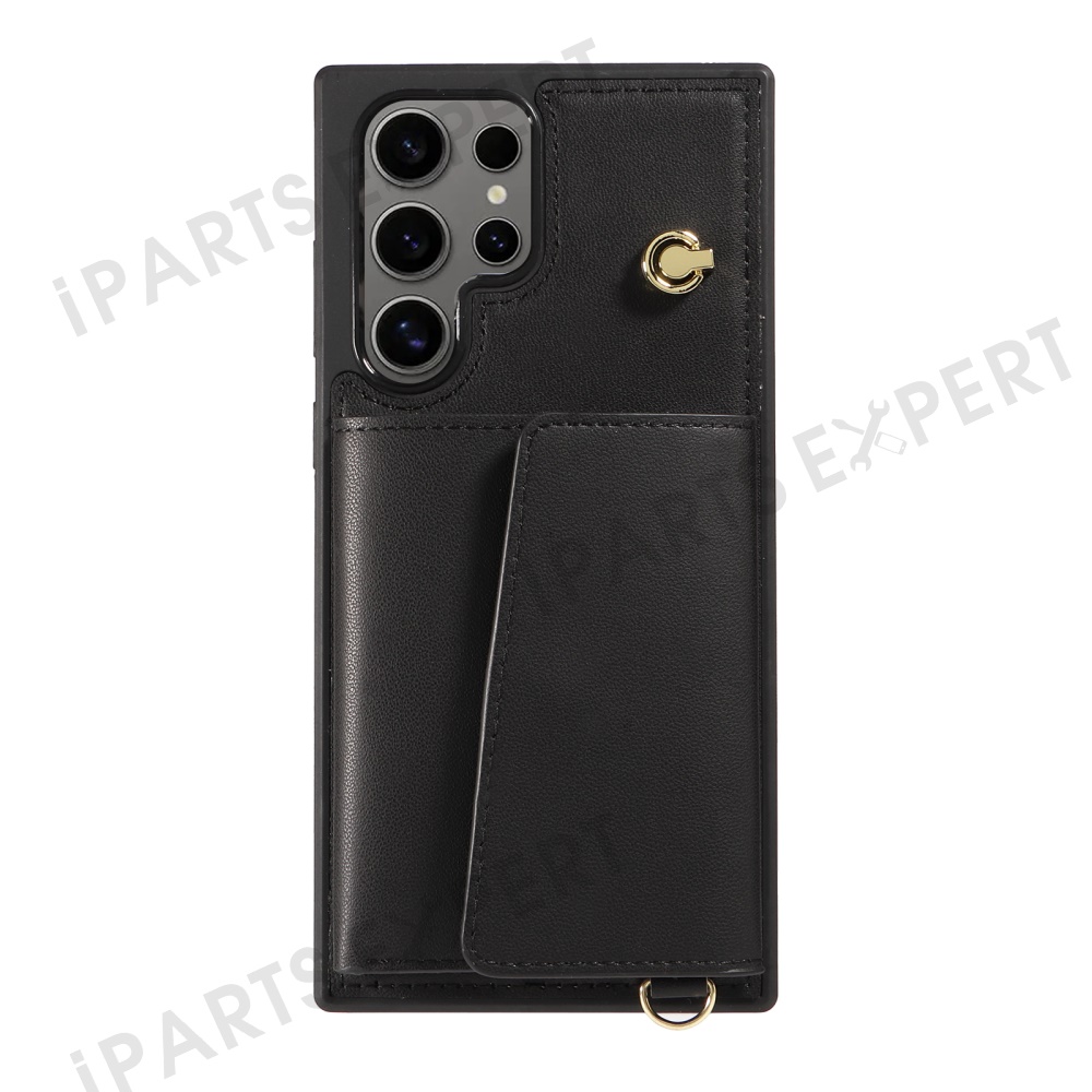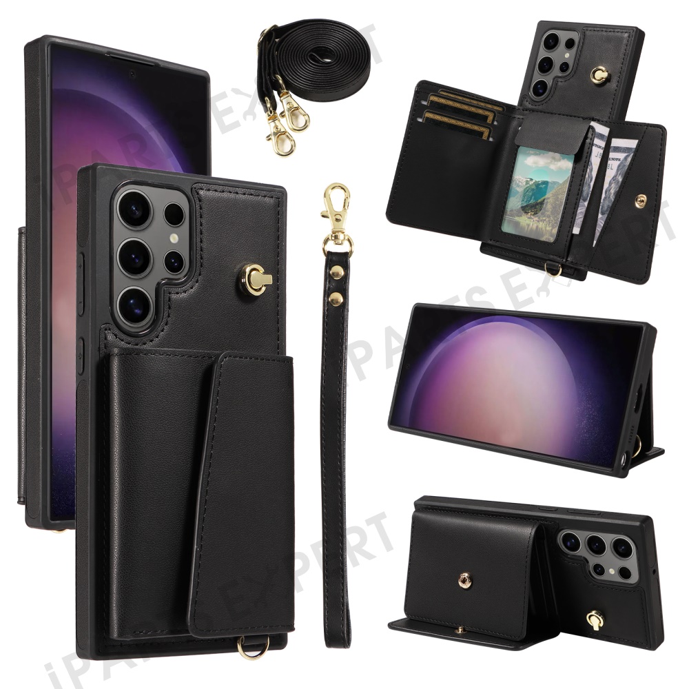For Samsung Galaxy S24 Ultra Crossbody Phone Case Card Holder Kickstand Leather Coated TPU Mobile Cover - Black
