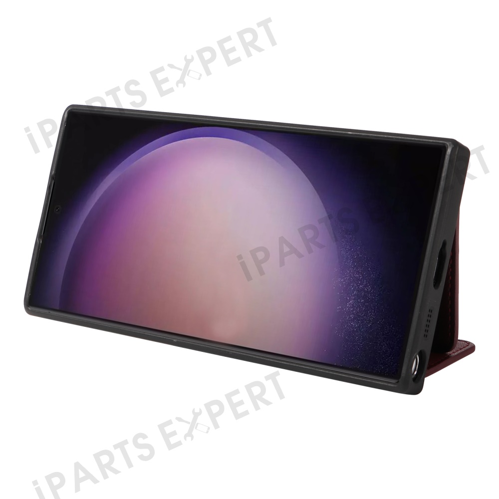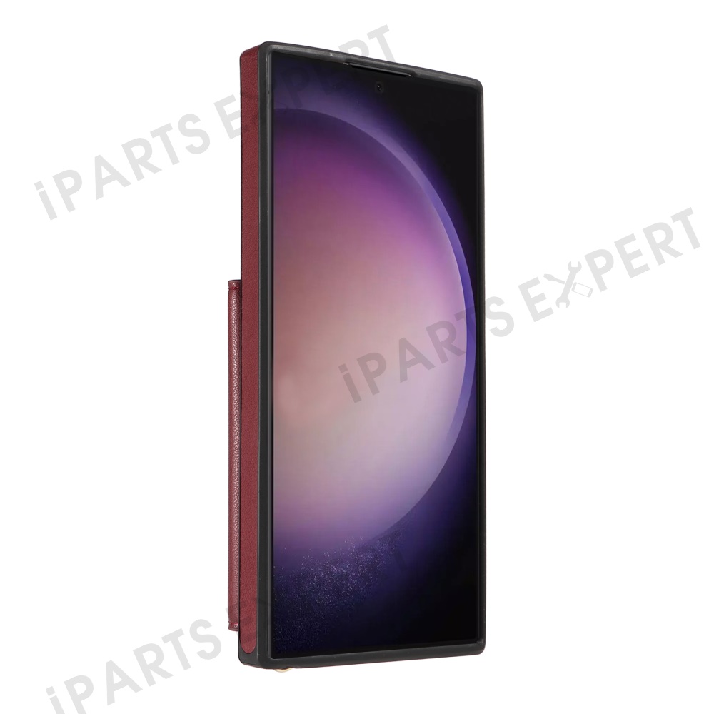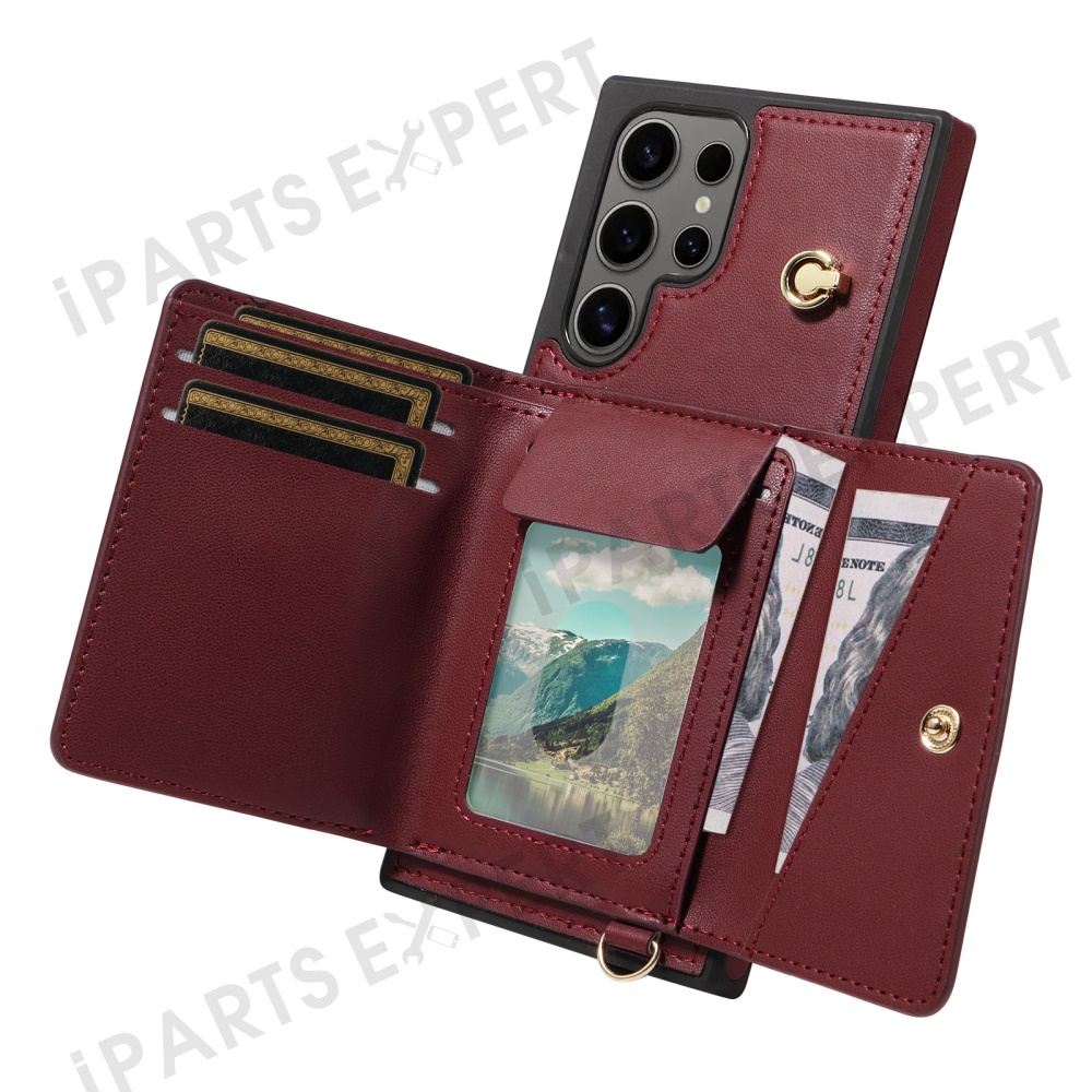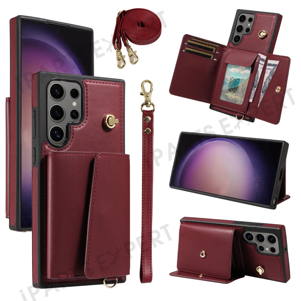 For Samsung Galaxy S24 Ultra Crossbody Phone Case Card Holder Kickstand Leather Coated TPU Mobile Cover - Wine Red
