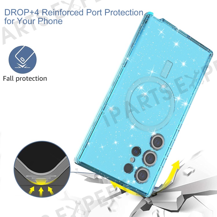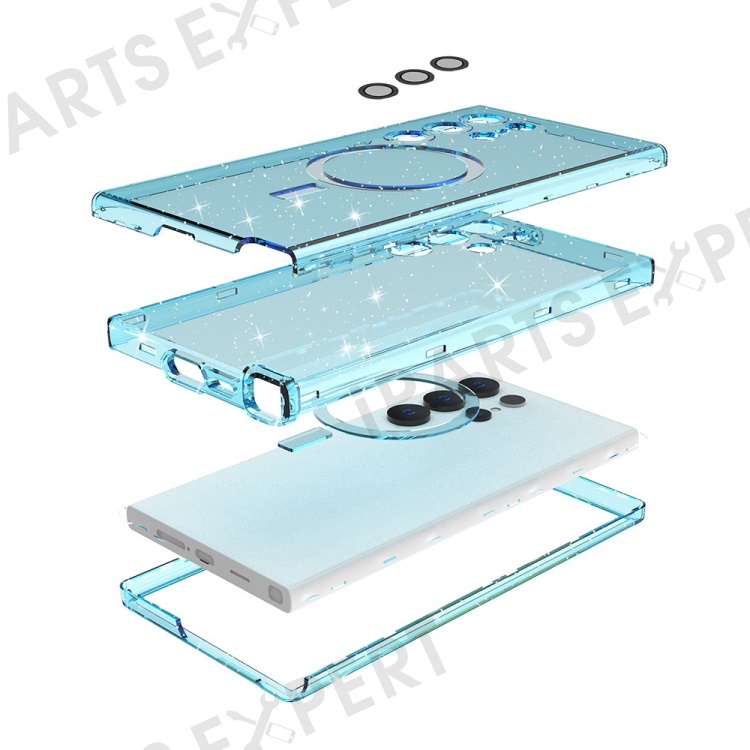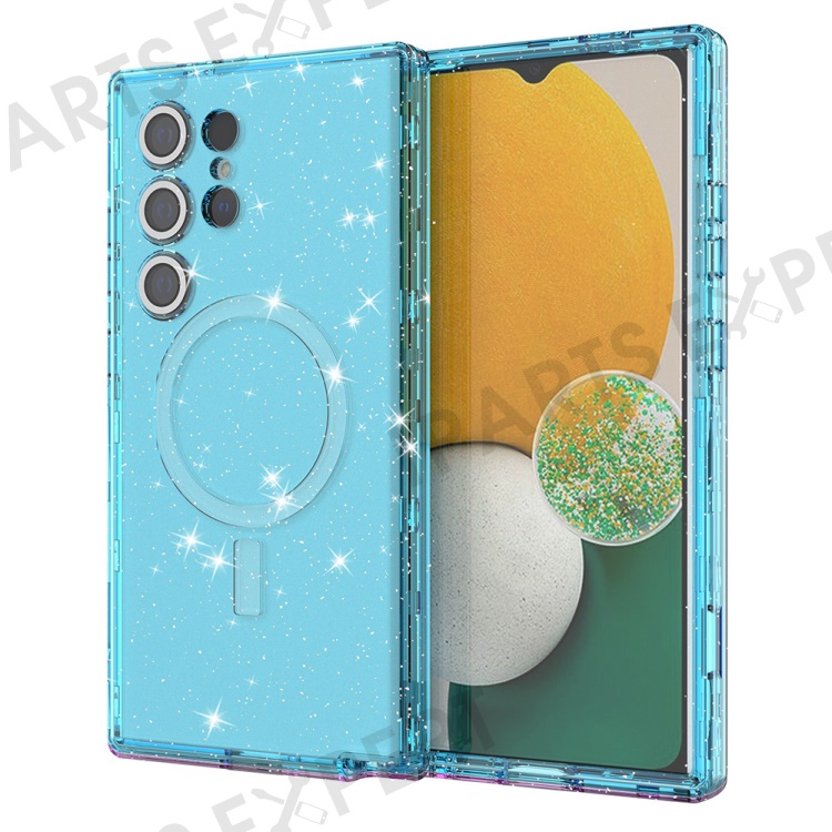 For Samsung Galaxy S24 Ultra Magnetic Case Glitter Clear Phone Back Cover with Lens Film - Transparent Blue