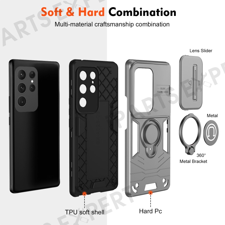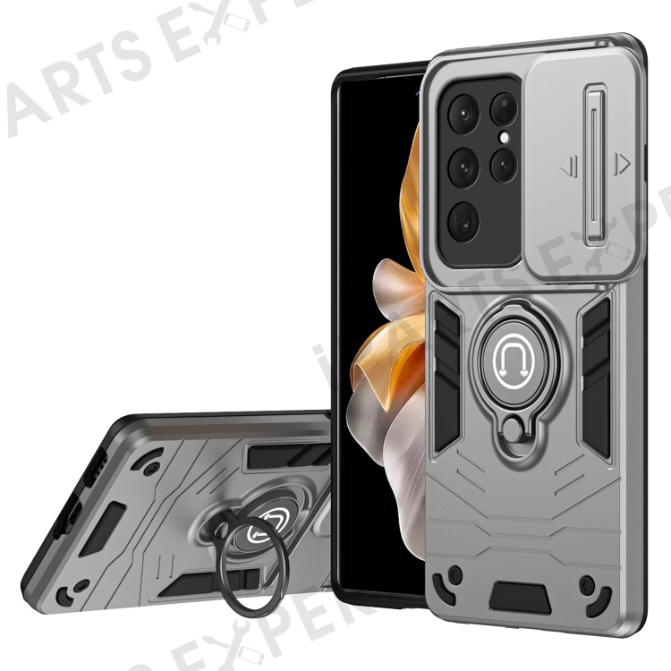 For Samsung Galaxy S24 Ultra Phone Case Slide Lens Lid Anti-fall Phone Cover with Ring Kickstand - Grey