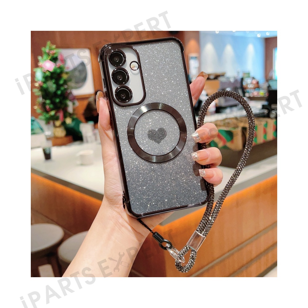 For Samsung Galaxy S25 Magnetic Case TPU Phone Cover with Strap Heart Gradient Sparkle - Black
