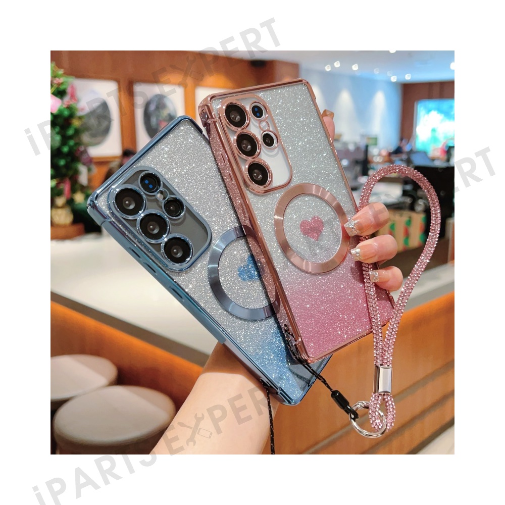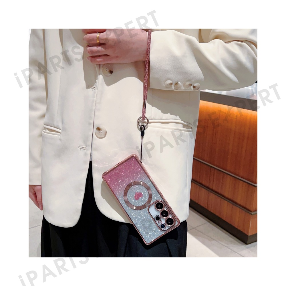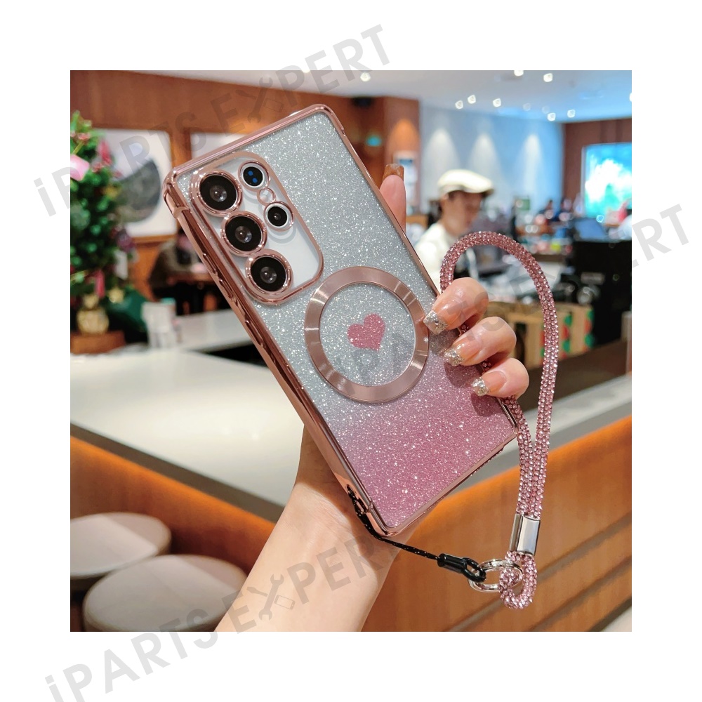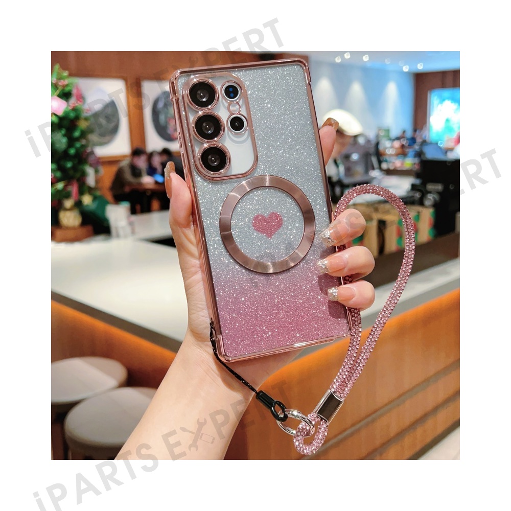For Samsung Galaxy S25 Ultra Magnetic Case TPU Phone Cover with Strap Heart Gradient Sparkle - Rose Pink