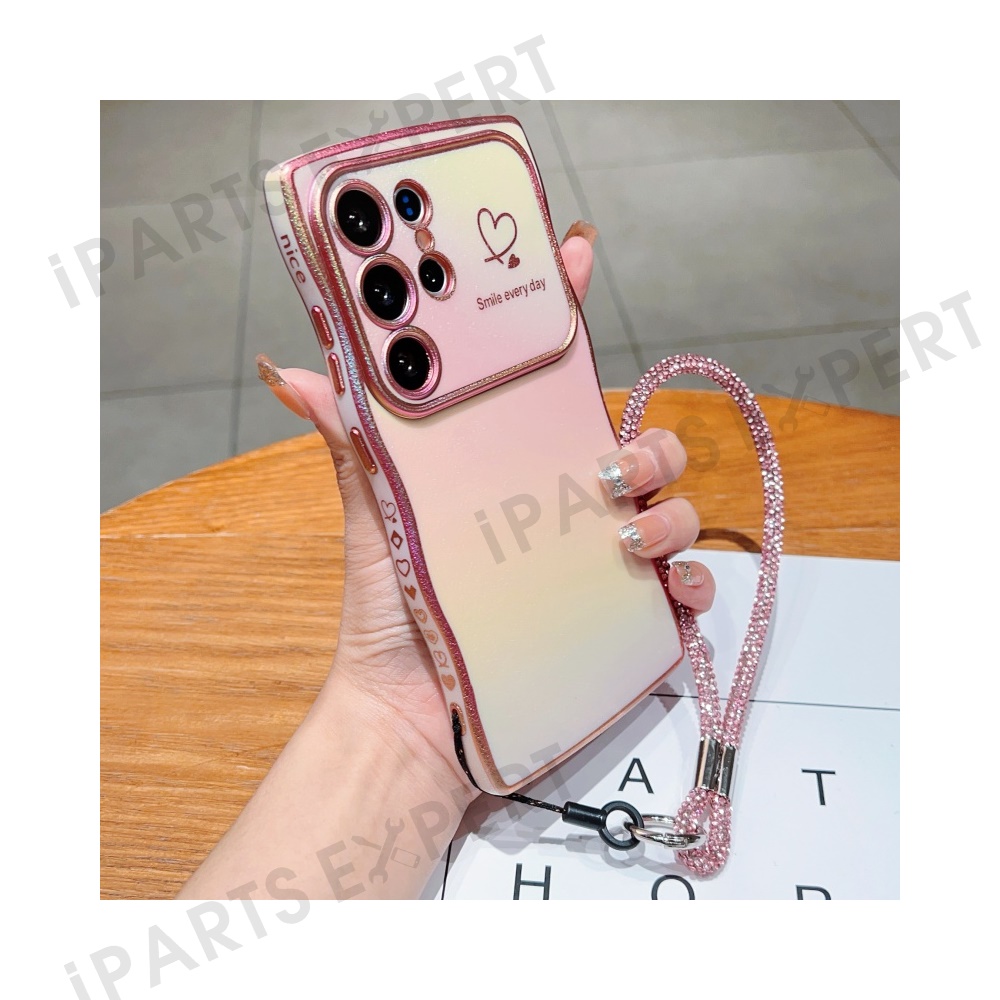 For Samsung Galaxy S25 Ultra Case with Strap TPU Phone Back Cover Dazzling Design Curly Shape Love Heart - Colorful Pink