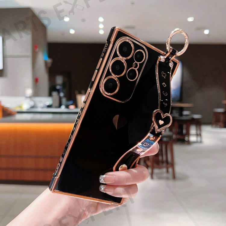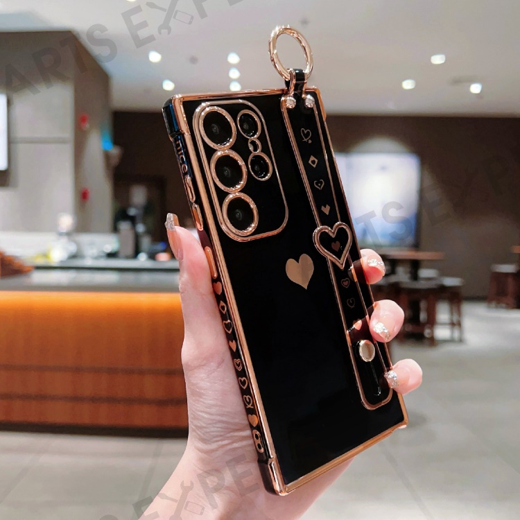 For Samsung Galaxy S25 Ultra Case Wristband Kickstand Love Heart TPU Phone Cover Finger Holder - Black