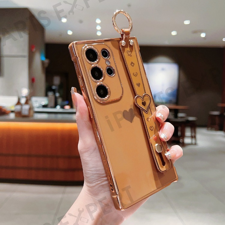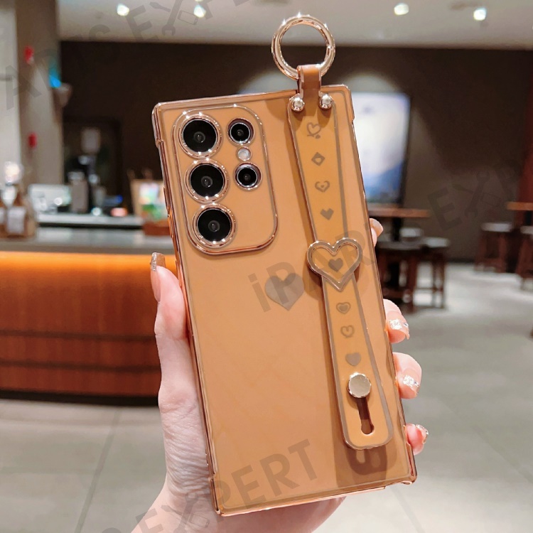 For Samsung Galaxy S25 Ultra Case Wristband Kickstand Love Heart TPU Phone Cover Finger Holder - Brown