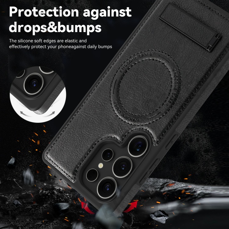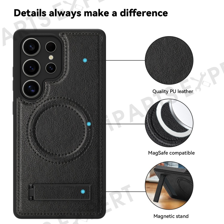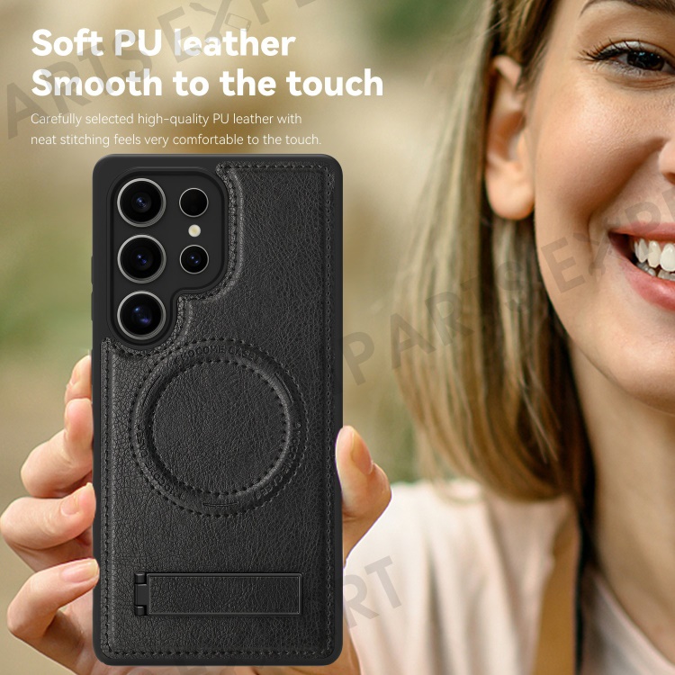 For Samsung Galaxy S25 Ultra Magnetic Case with Folded Kickstand PC Silicone Leather Phone Back Cover - Black