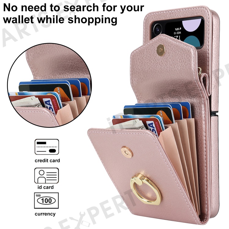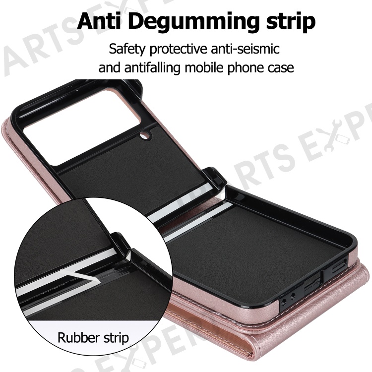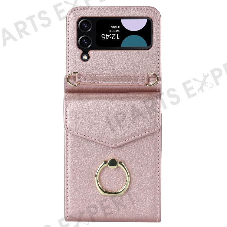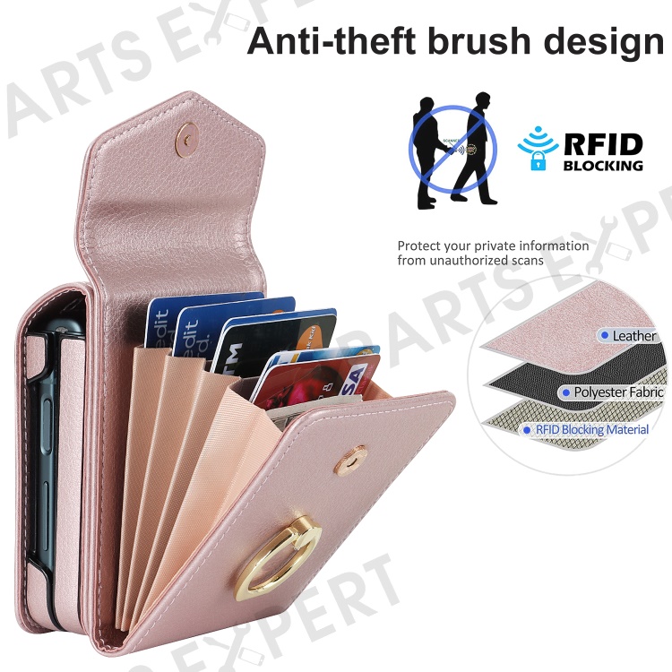 For Samsung Galaxy Z Flip3 5G Ring Kickstand Case RFID Blocking Multiple Card Slots Leather+PC Cover - Rose Gold