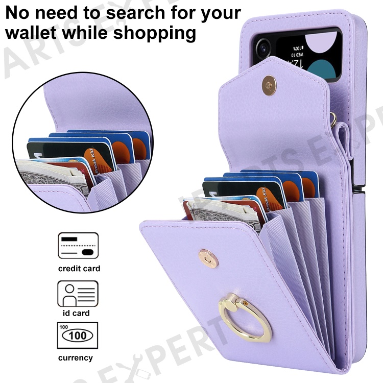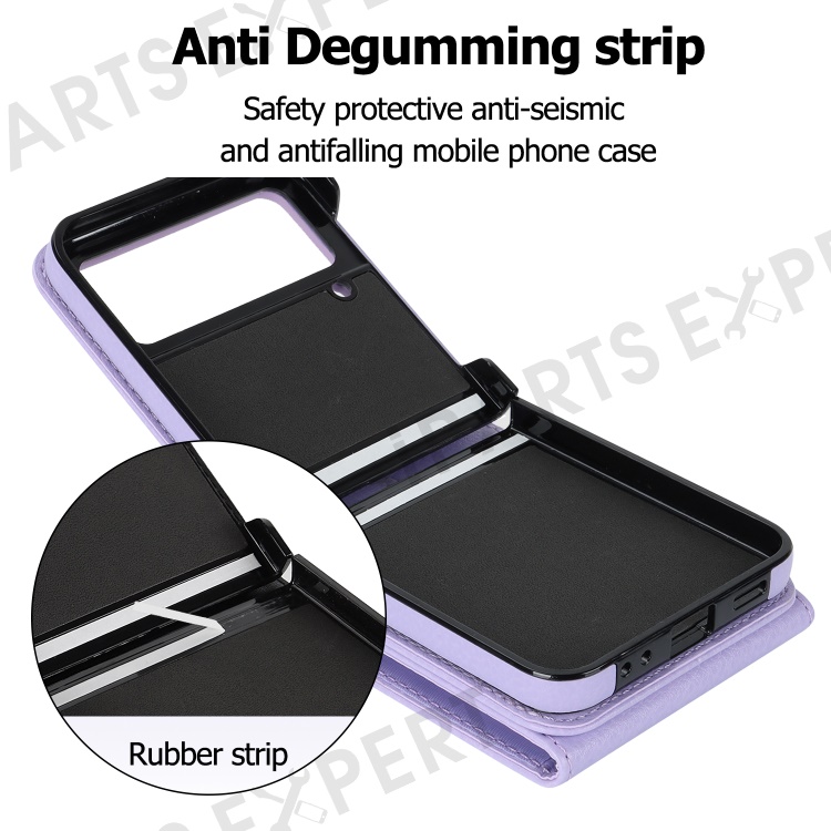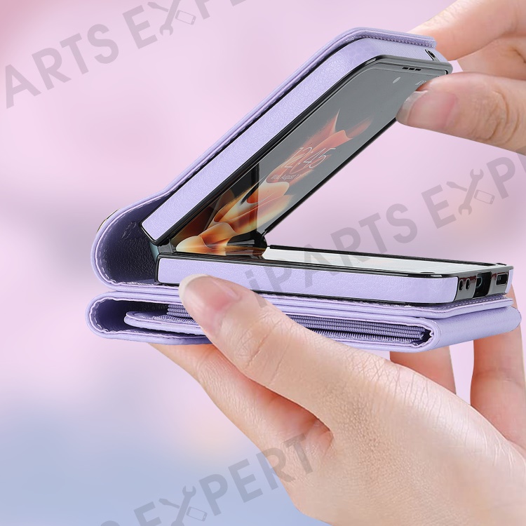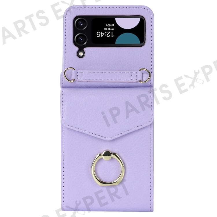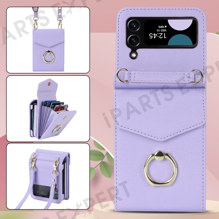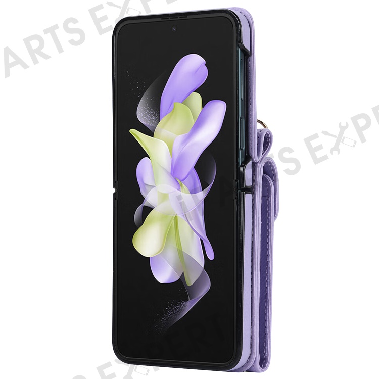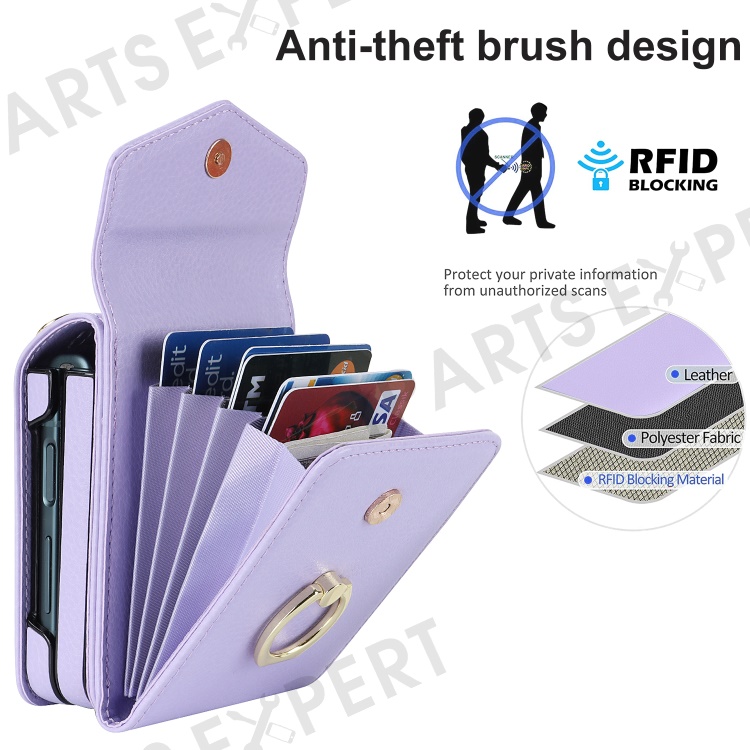 For Samsung Galaxy Z Flip4 5G RFID Blocking Phone Case Multiple Card Slots Ring Kickstand Leather+PC Cover - Light Purple
