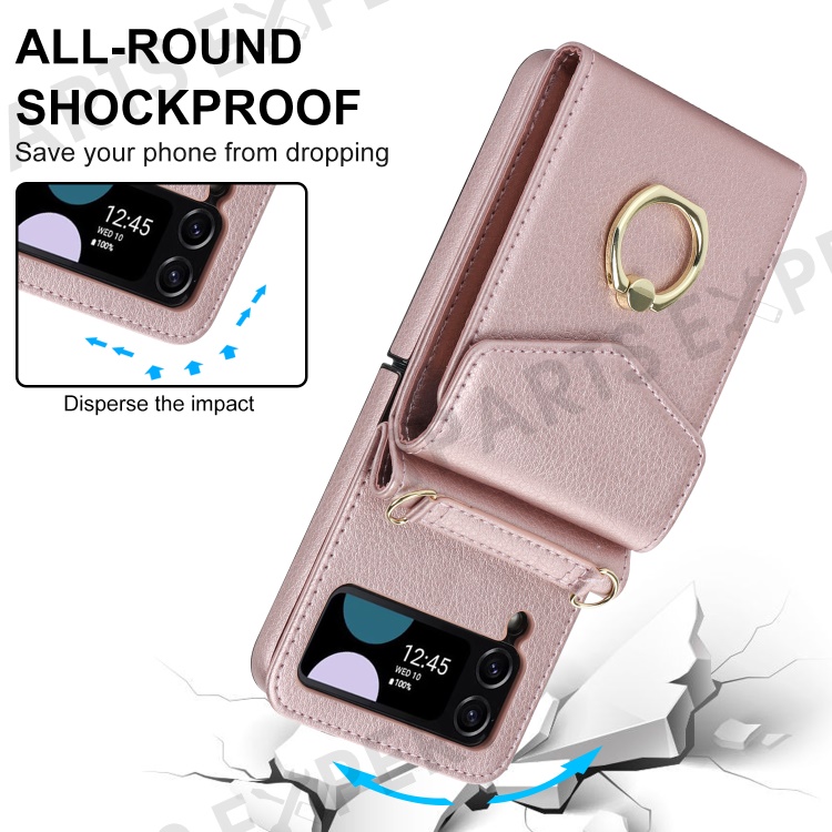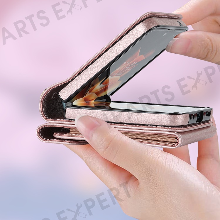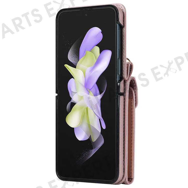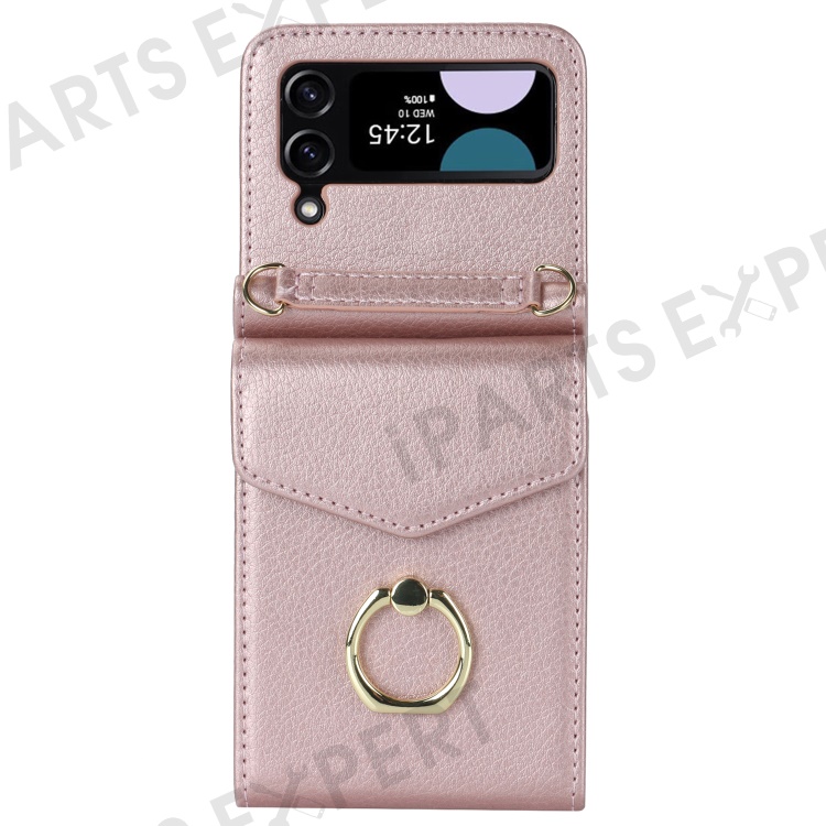 For Samsung Galaxy Z Flip4 5G RFID Blocking Phone Case Multiple Card Slots Ring Kickstand Leather+PC Cover - Rose Gold
