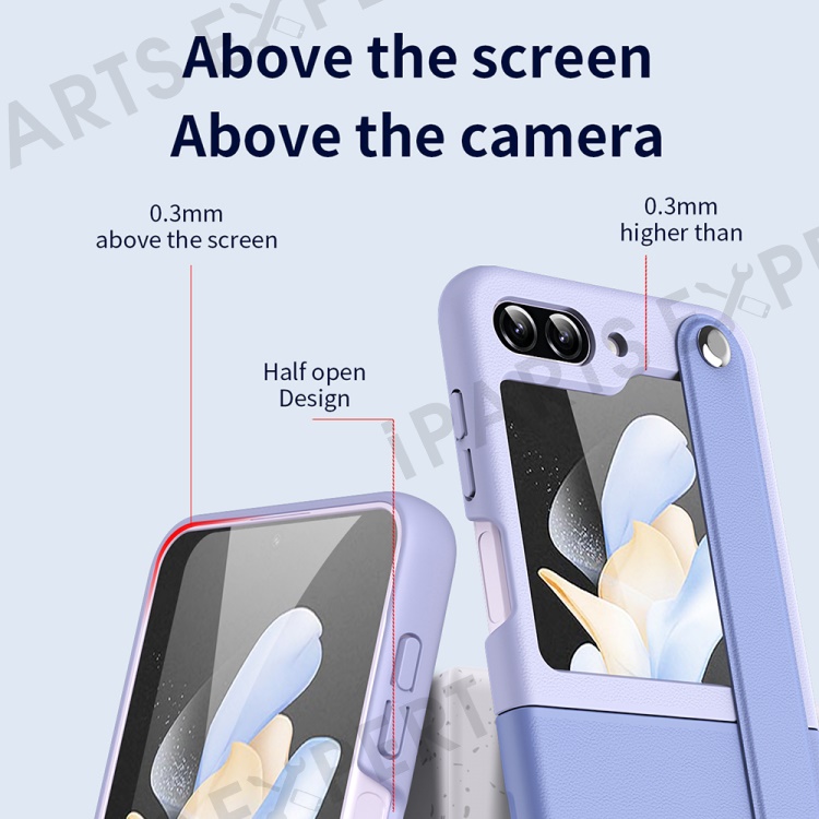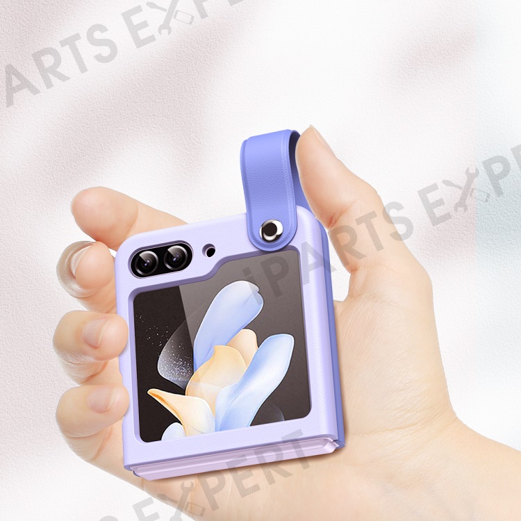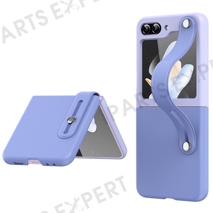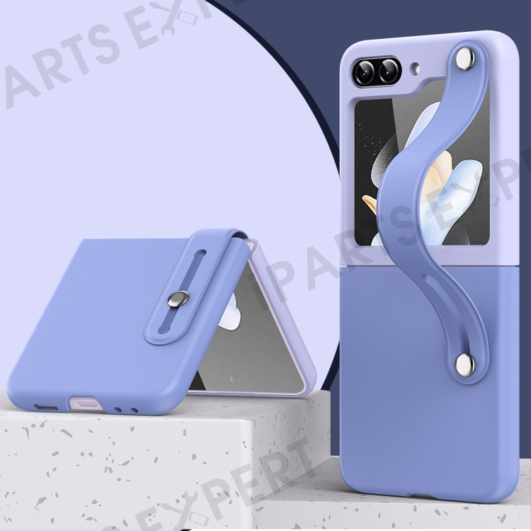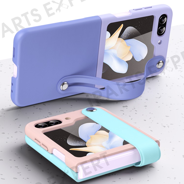 For Samsung Galaxy Z Flip5 5G Contrast Color PU Leather Coated PC Phone Case Hand Strap Kickstand Cover - Sky Blue Light Purple