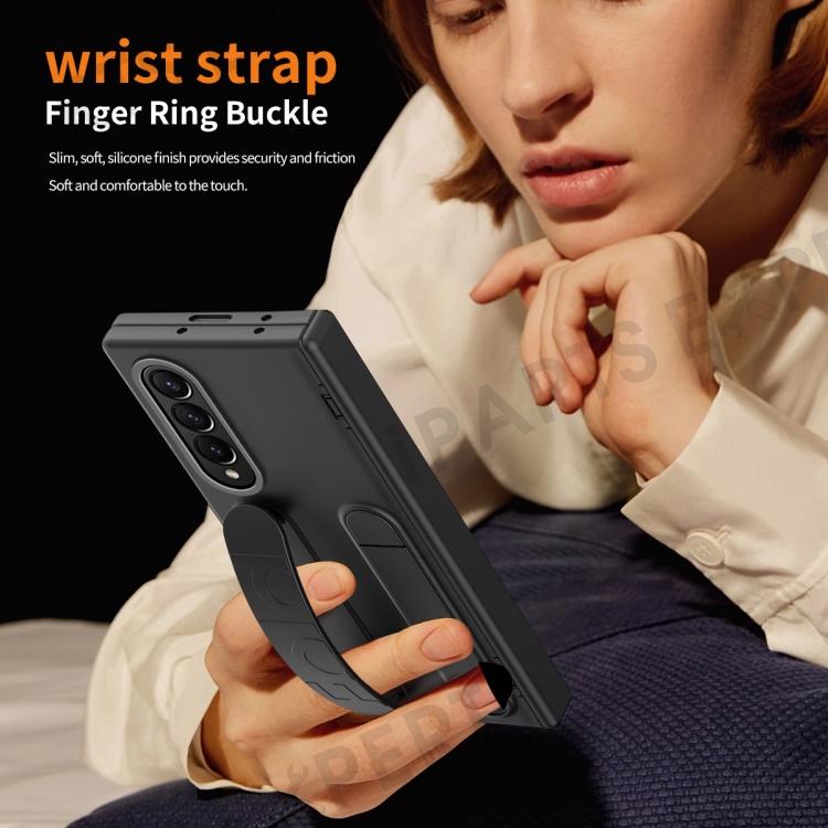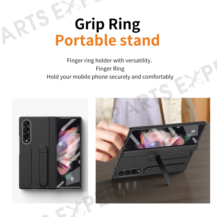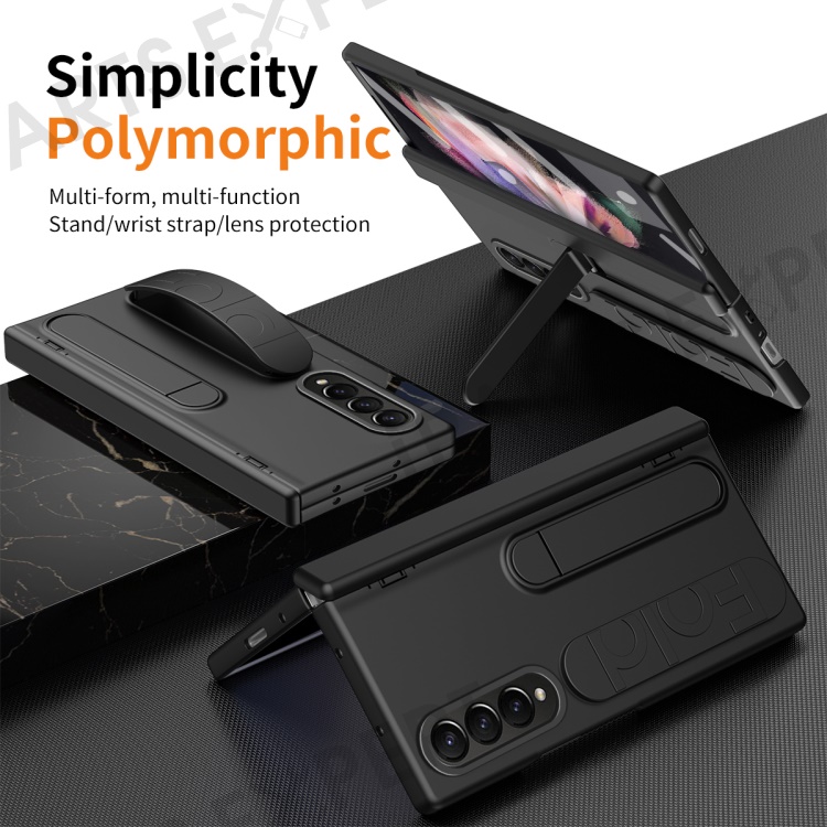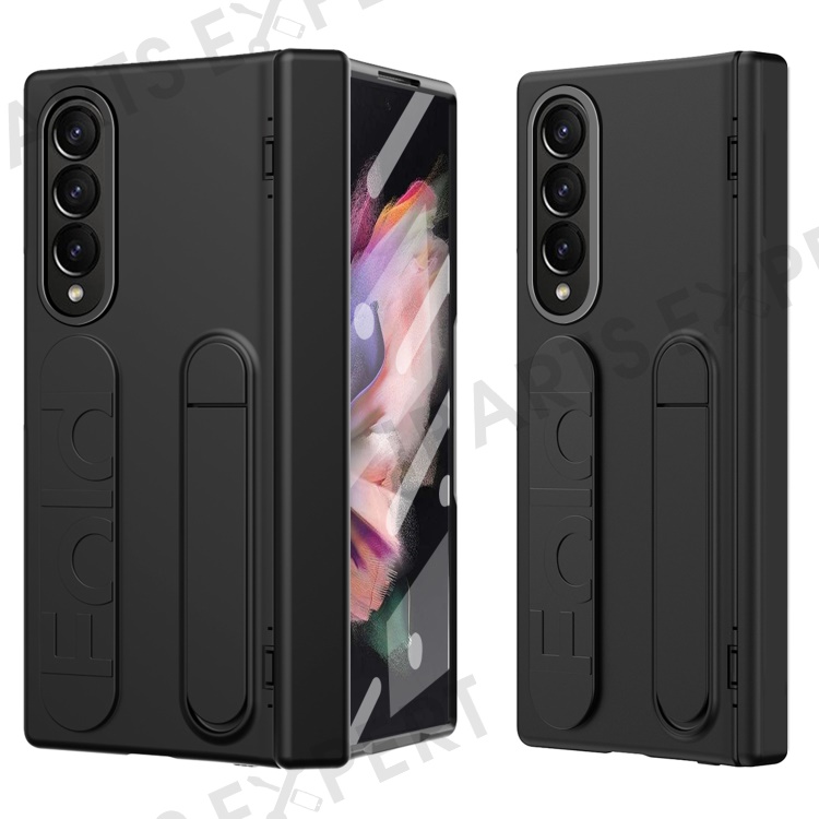 For Samsung Galaxy Z Fold3 5G Case Kickstand Wristband PC Phone Cover with Tempered Glass Film - Black