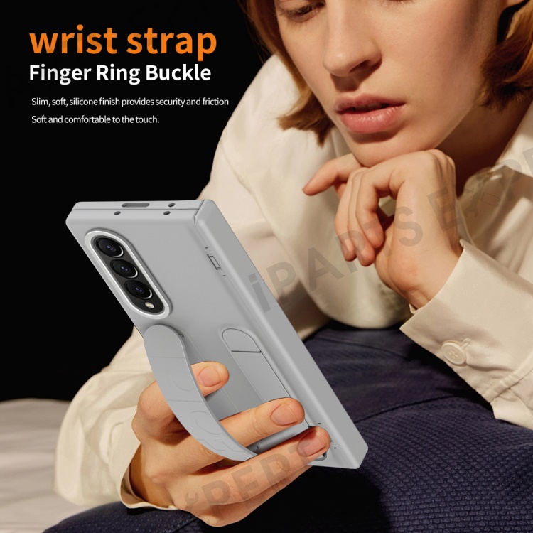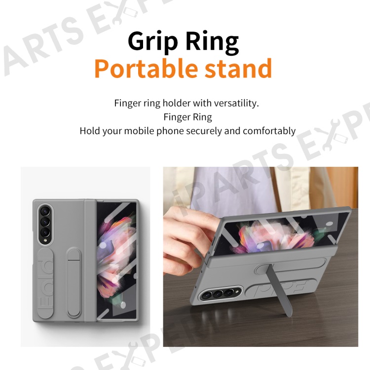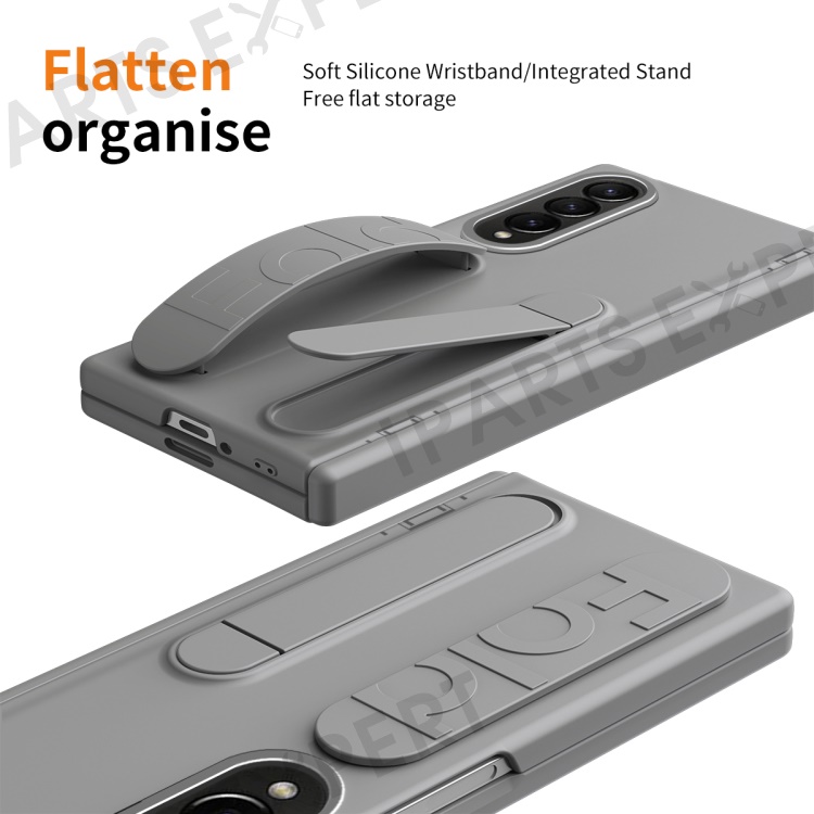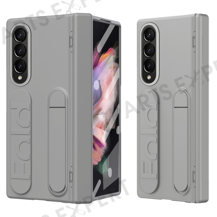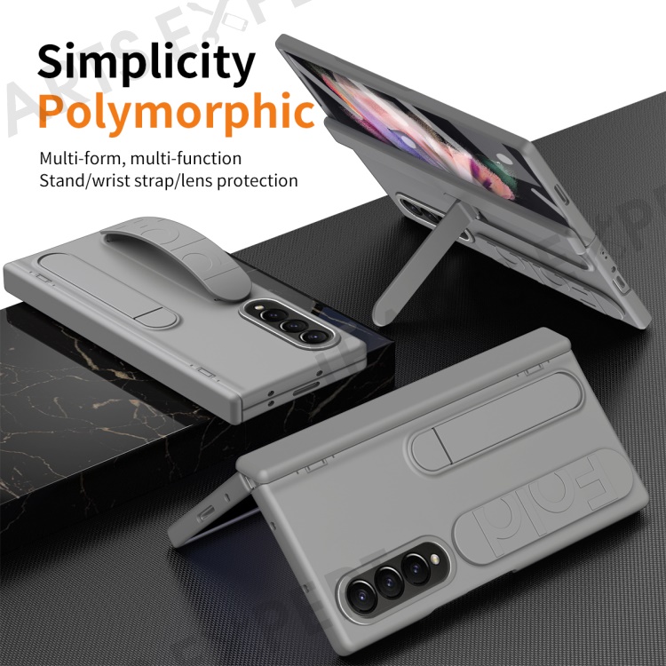 For Samsung Galaxy Z Fold3 5G Case Kickstand Wristband PC Phone Cover with Tempered Glass Film - Grey