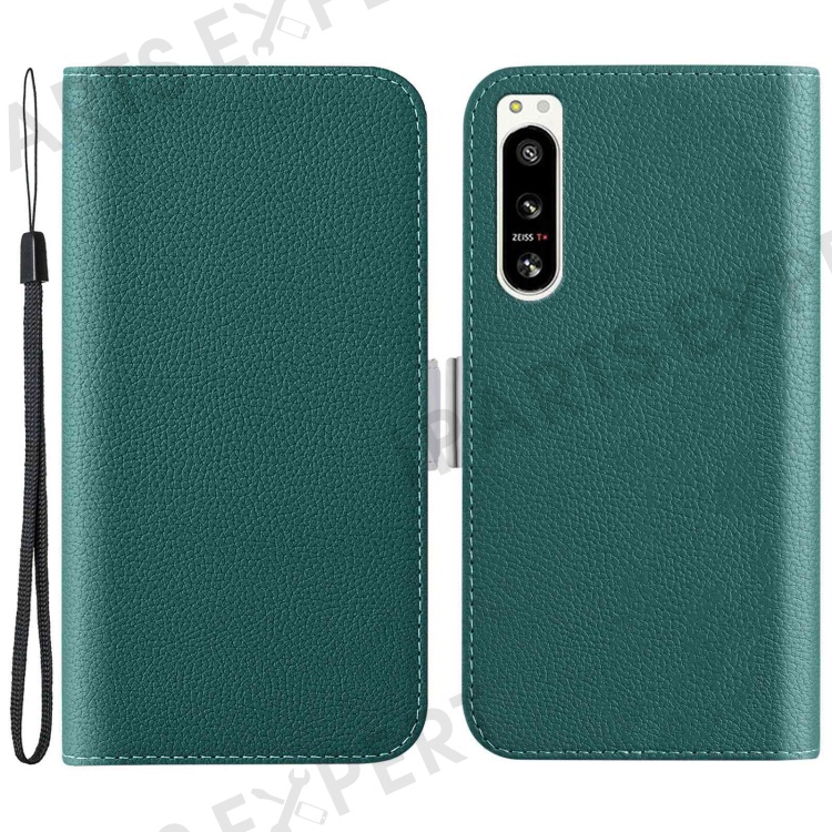 For Sony Xperia 5 IV 5G Cell Phone Cover PU Leather+TPU Litchi Texture Phone Stand Anti-fingerprint Dustproof Wallet Case - Dark Green