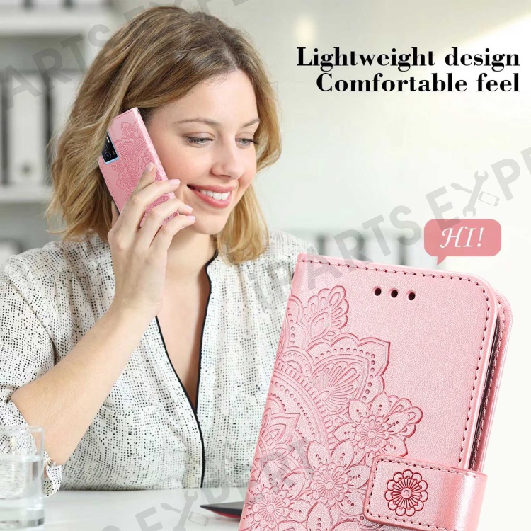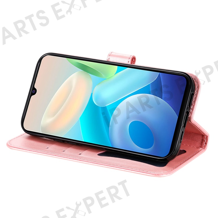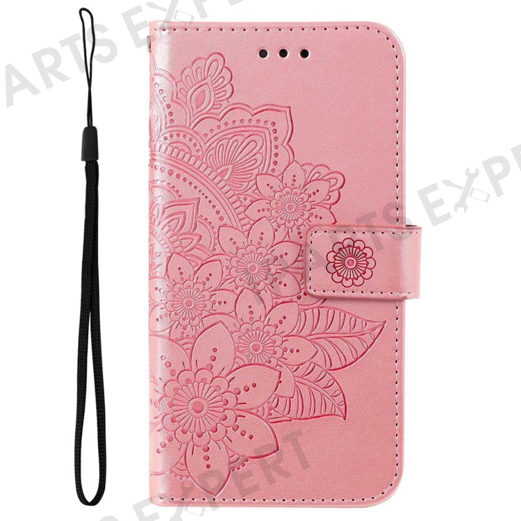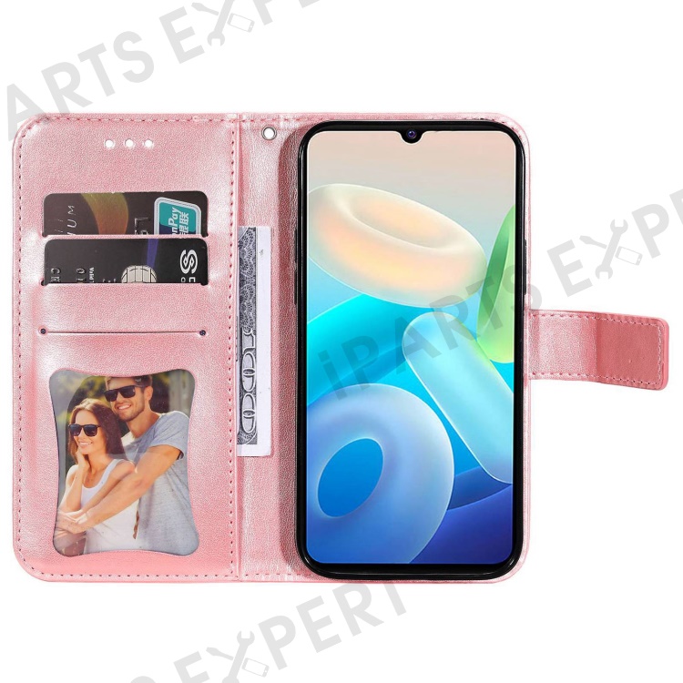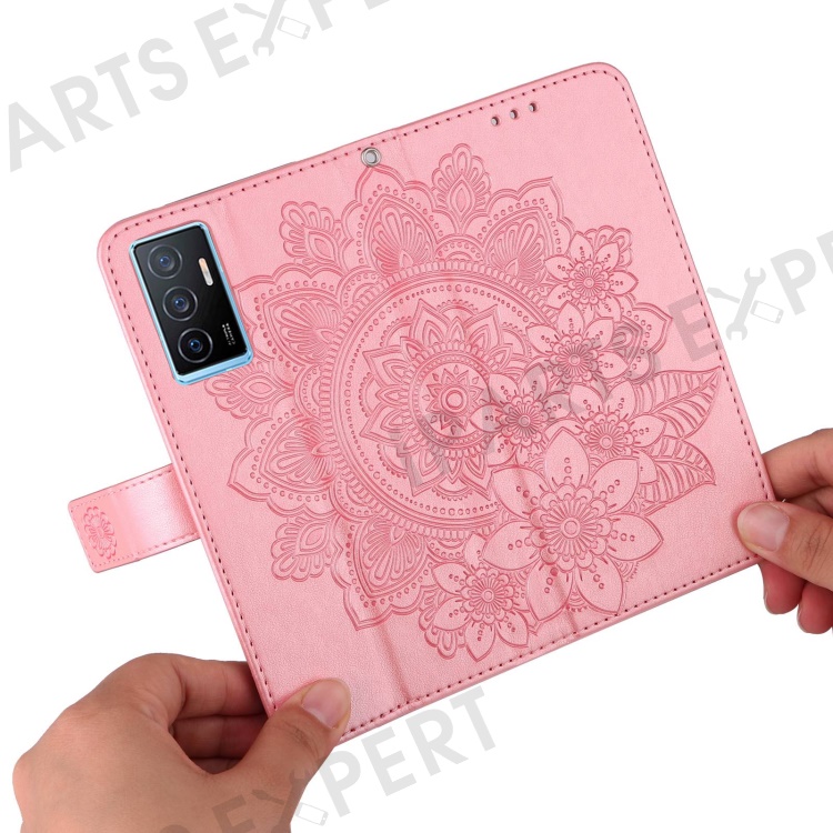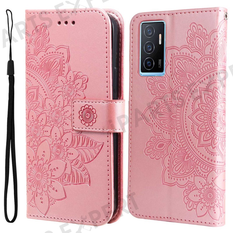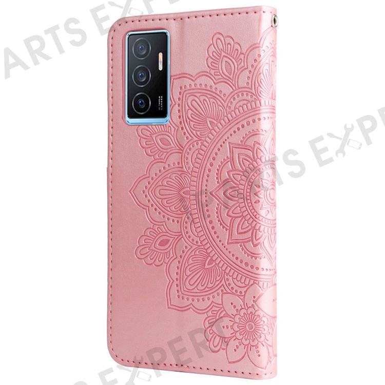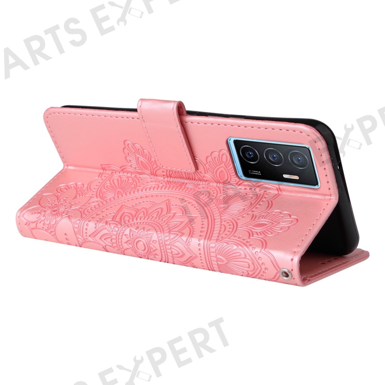 For vivo Y75 4G / V23e 4G / 5G Fall Prevention Flower Imprinting PU Leather Phone Protective Case Flip Stand Wallet Cover with Strap - Rose Gold