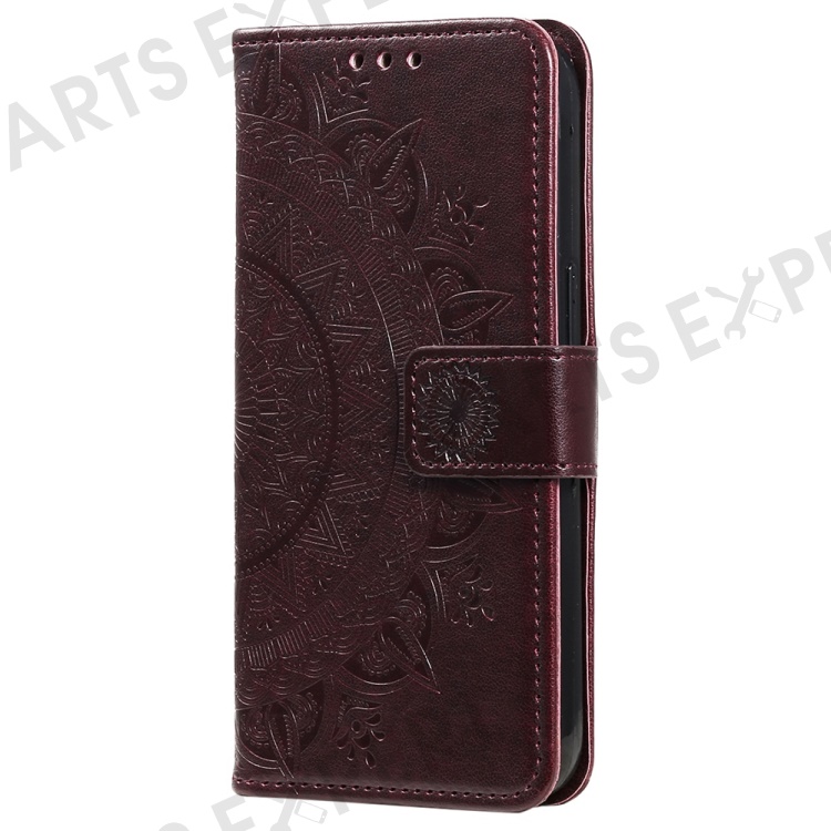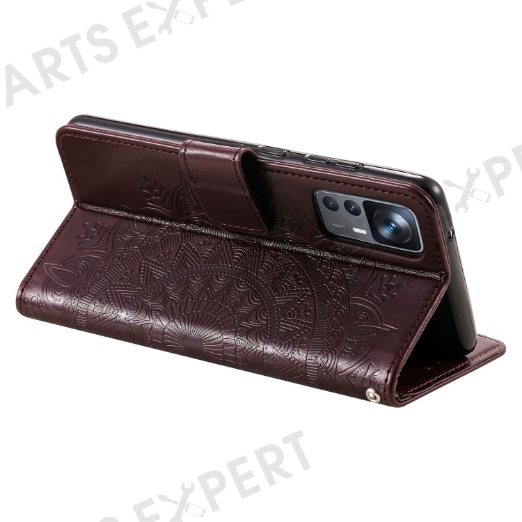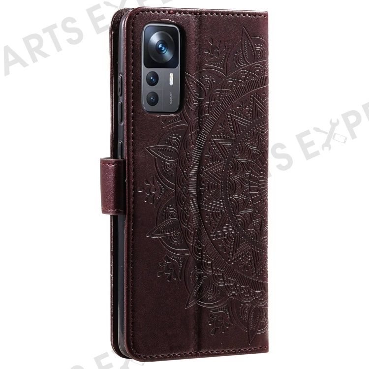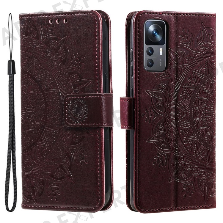 For Xiaomi 12T 5G / Redmi K50 Ultra 5G / 12T Pro 5G Mandala Flower Pattern Imprinted Folding Stand PU Leather Case TPU Inner Shell Wallet Flip Cover with Strap - Brown