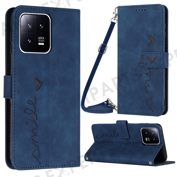 For Xiaomi 13 5G Stand PU Leather Wallet Flip Cover Imprinted Heart Shape Skin-touch Feeling Shockproof Phone Case with Shoulder Strap - Sapphire