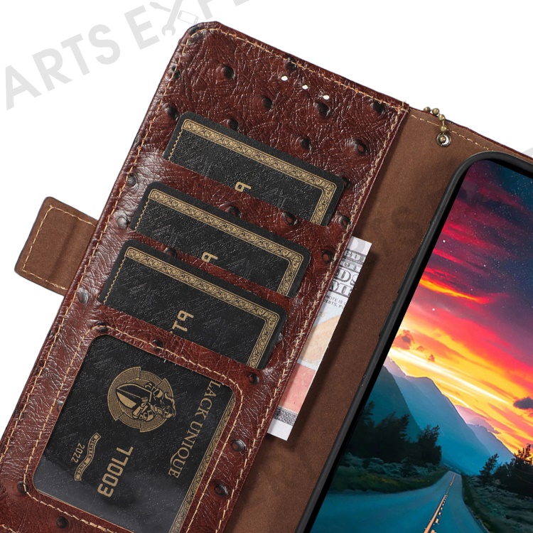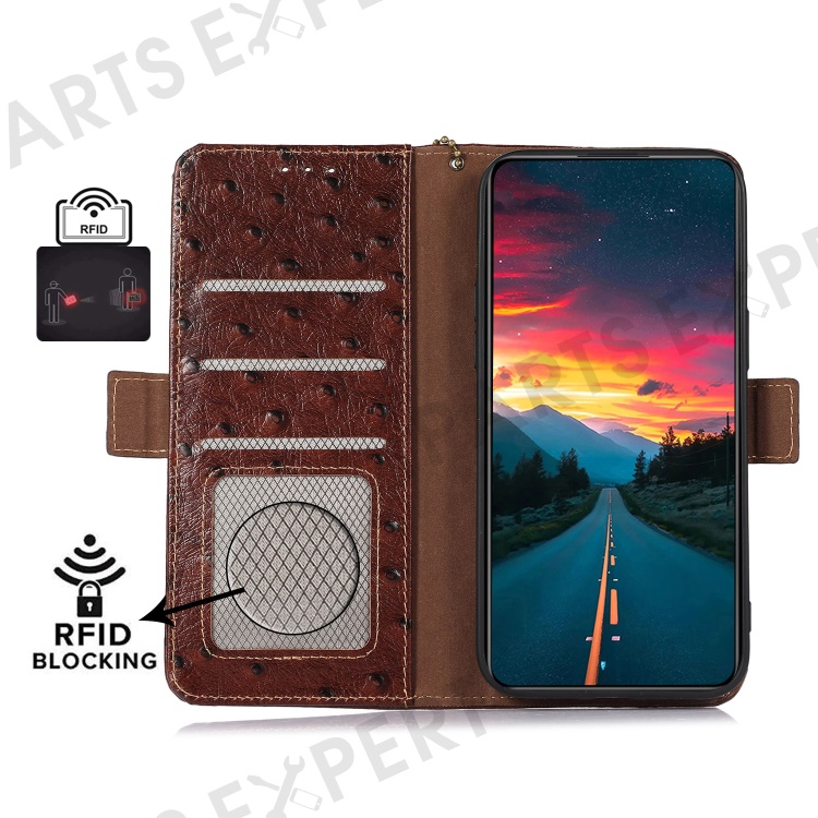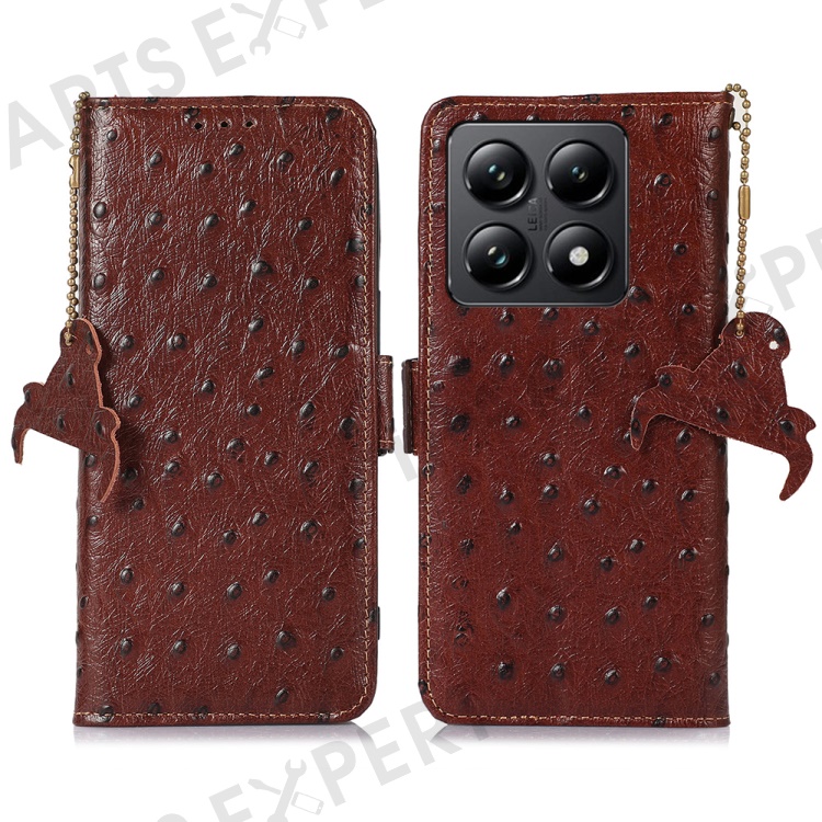For Xiaomi 14T Pro Case RFID Blocking Genuine Cow Leather Phone Case Ostrich Texture - Coffee