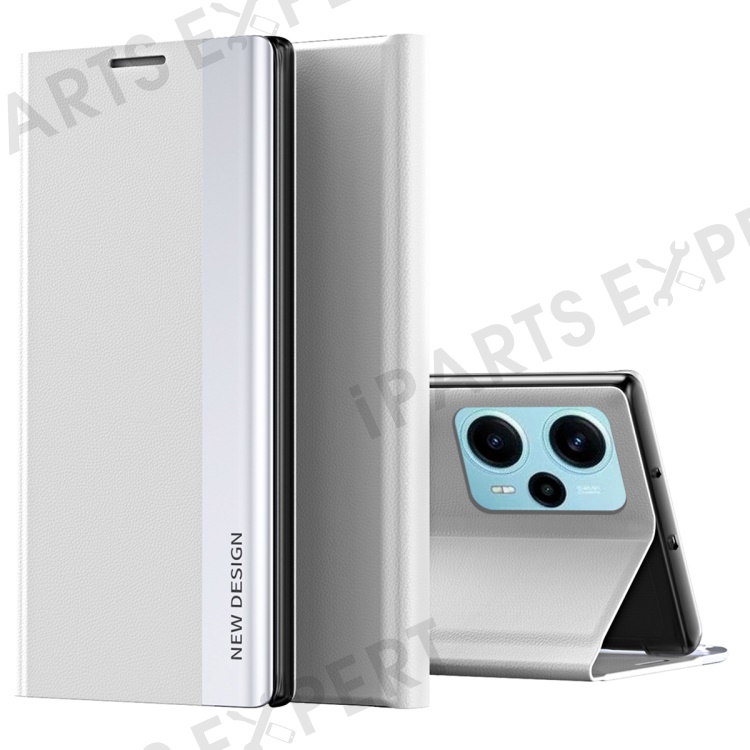 For Xiaomi Poco F5 5G / Redmi Note 12 Turbo PU Leather Flip Cover Electroplating Anti-Scratch Phone Case with Stand - White